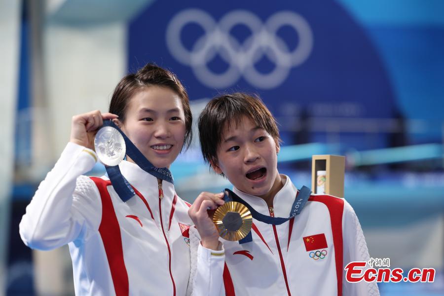 Gold medalist Quan Hongchan (R) and silver medalist Chen Yuxi of China pose for photos during the awarding ceremony after the women's 10m platform final of diving at the Paris 2024 Olympic Games in Saint-Denis, France, Aug. 6, 2024. (Photo: China News Service/Fu Tian)