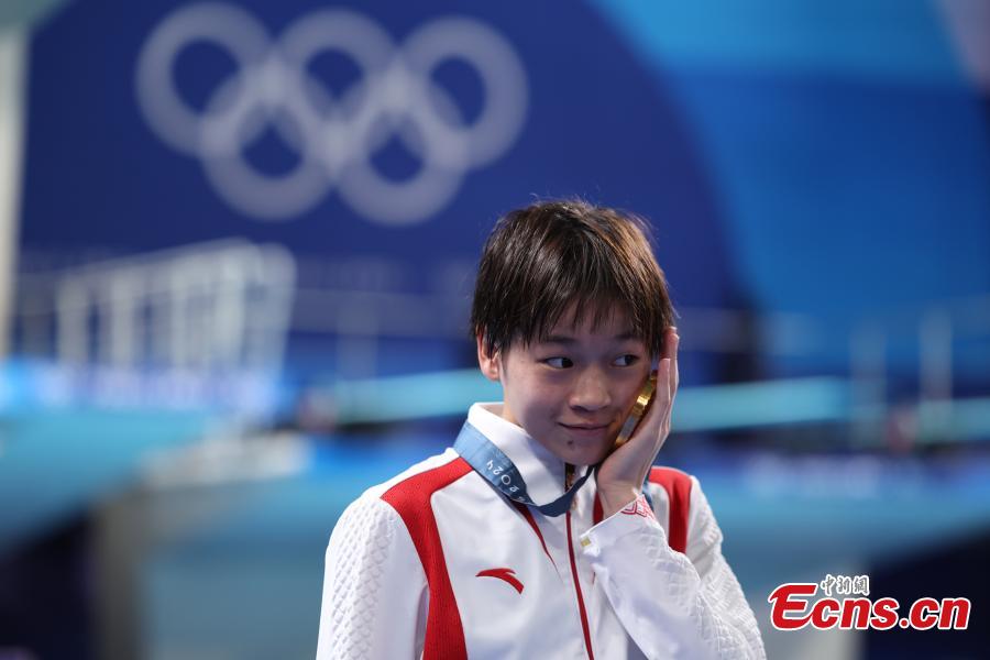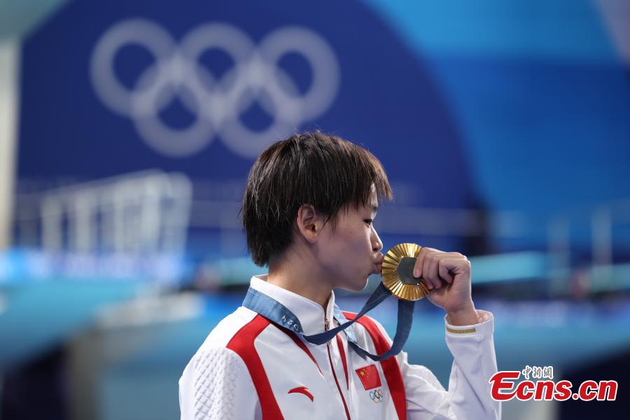 Gold medalist Quan Hongchan of China celebrates during the awarding ceremony after the women's 10m platform final of diving at the Paris 2024 Olympic Games in Saint-Denis, France, Aug. 6, 2024. (Photo: China News Service/Fu Tian)