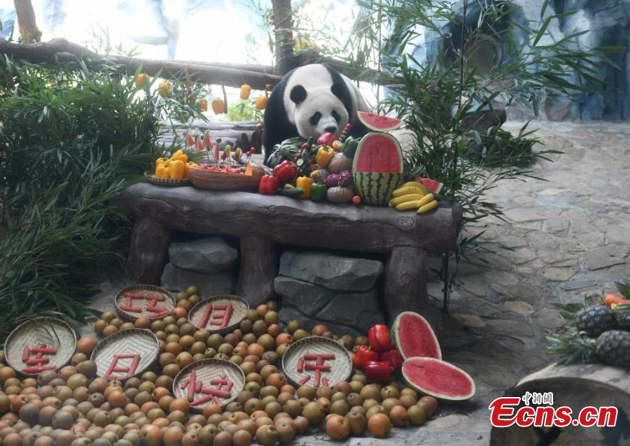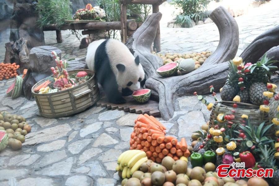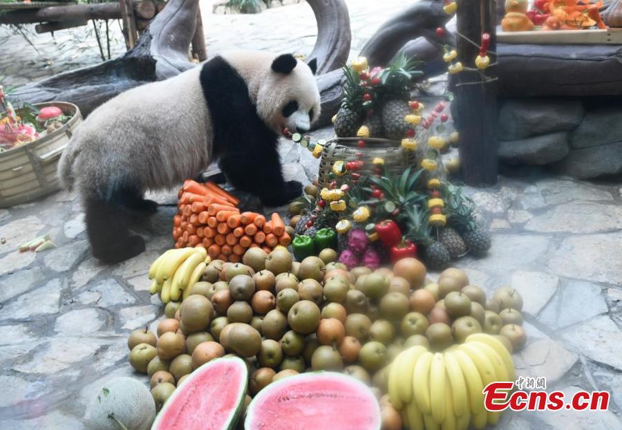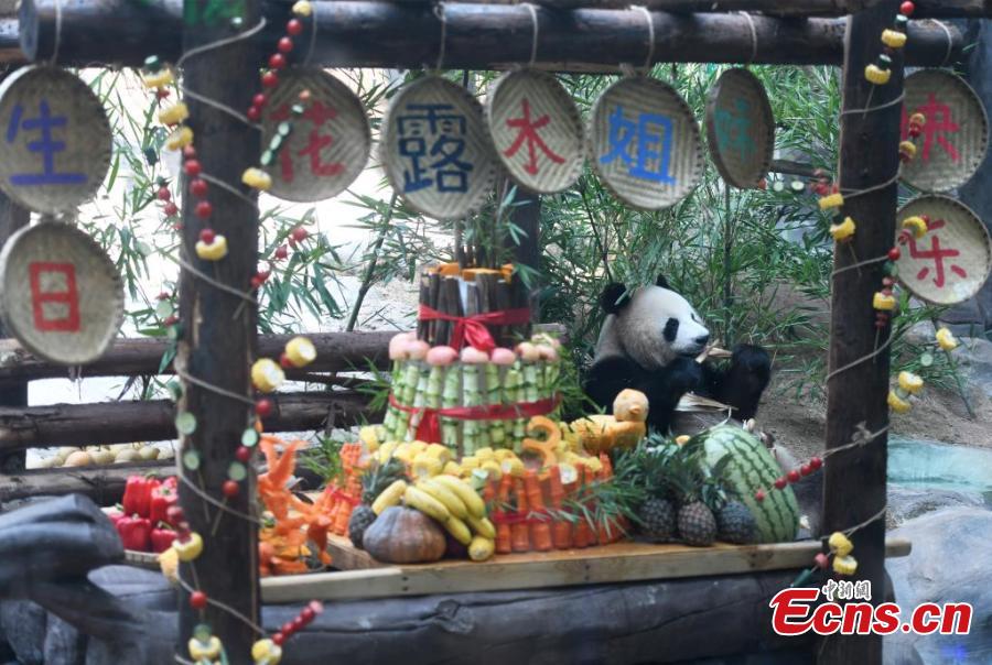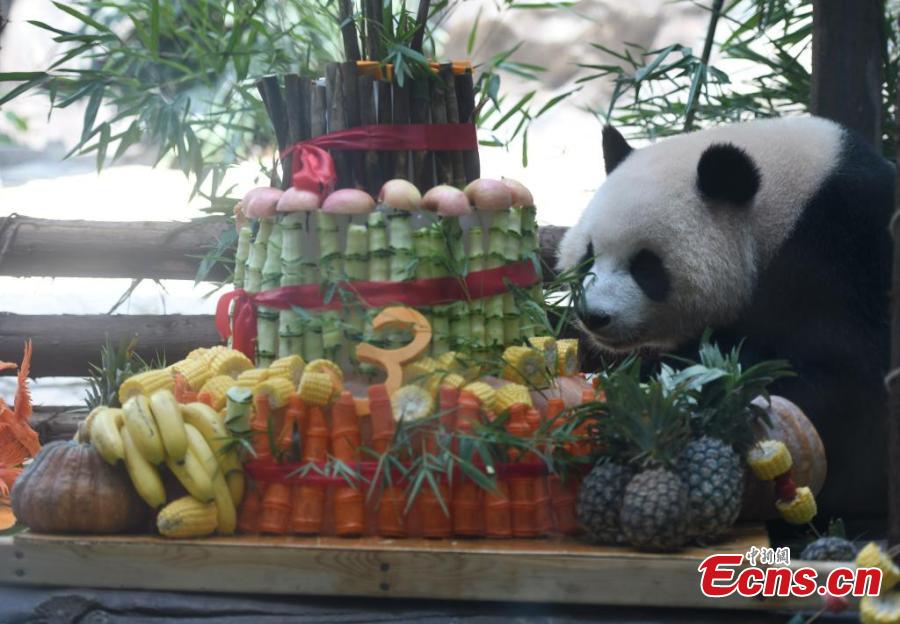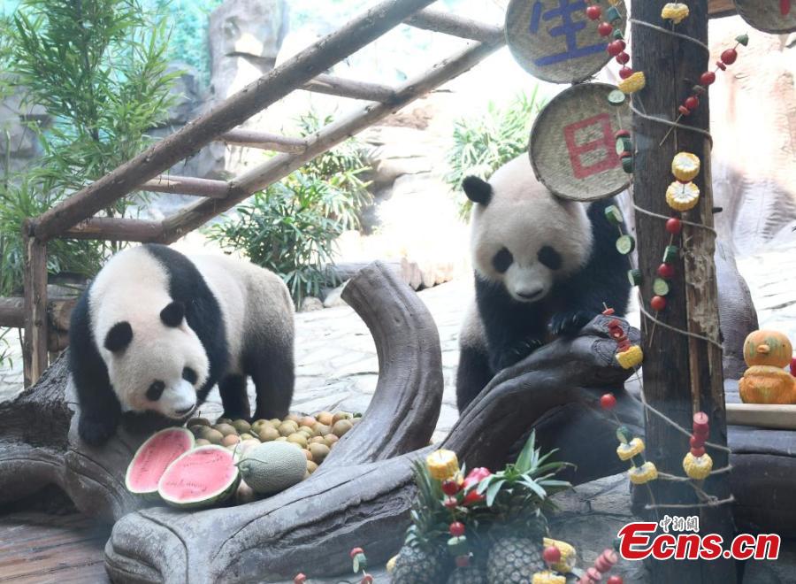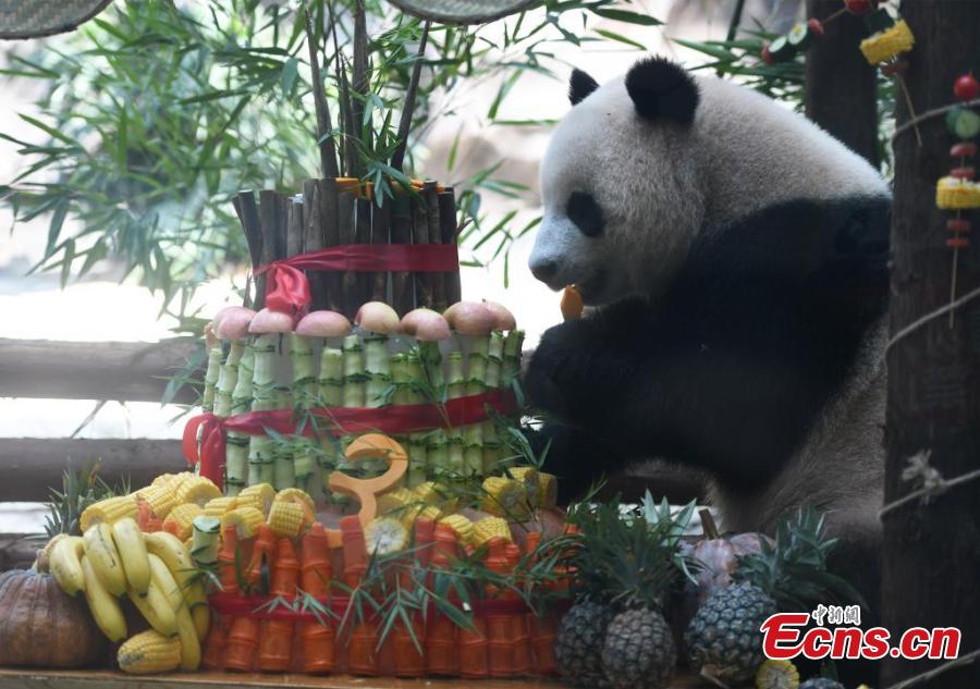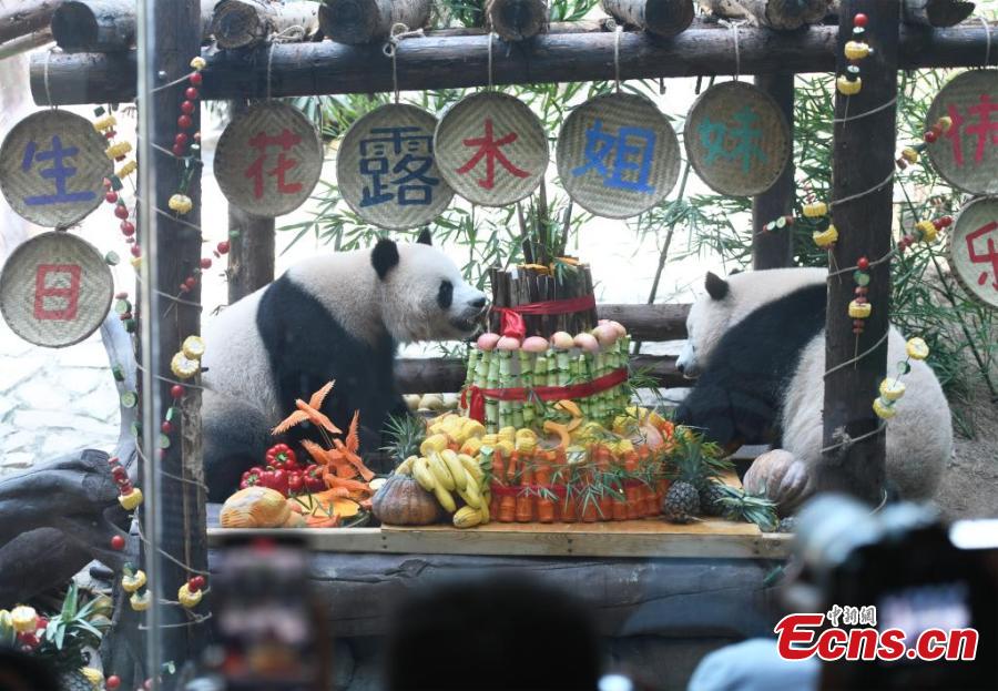 A special party was held to celebrate the birthdays of 3-year-old twin pandas Qing Hua, Qing Lu and 6-year-old panda Qiao Yue on Tuesday.