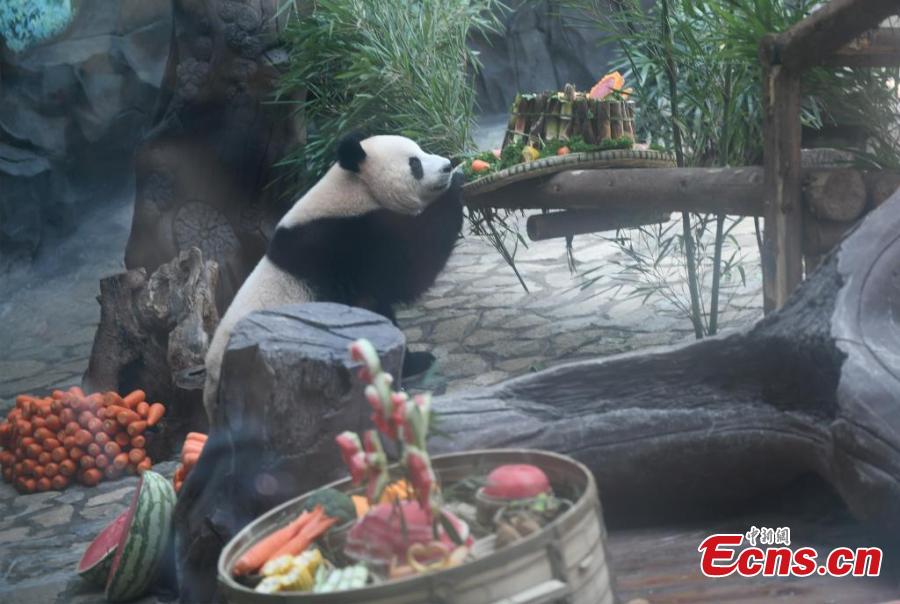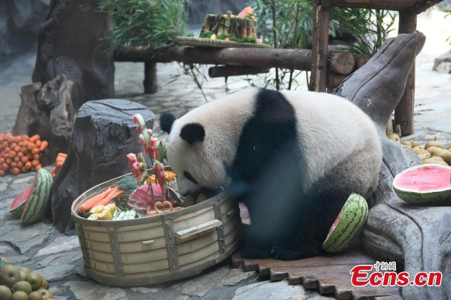 A giant panda enjoys a birthday treat at Locajoy Animal Theme Park in Chongqing, Aug. 6, 2024. (Photo: China News Service/Zhou Yi)