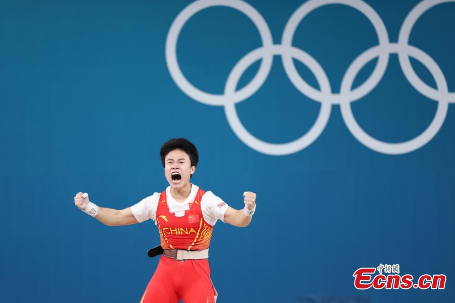 Hou Zhihui of China celebrates after winning the women's 49kg of weightlifting at the Paris 2024 Olympic Games in Paris, France, Aug. 7, 2024.(Photo: China News Service/Sheng Jiapeng)