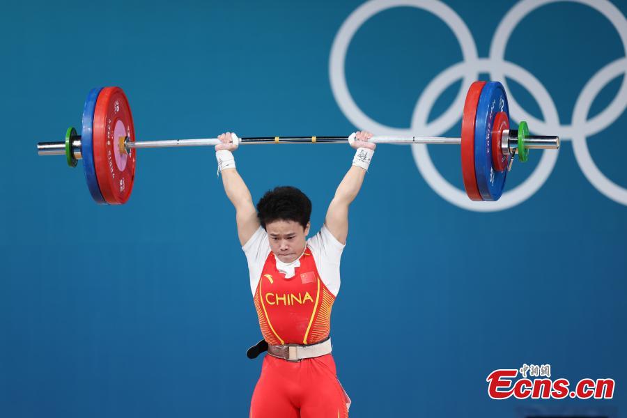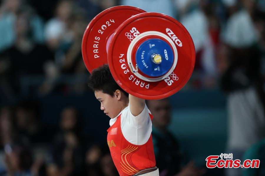 Hou Zhihui of China competes during the women's 49kg of weightlifting at the Paris 2024 Olympic Games in Paris, France, Aug. 7, 2024.(Photo: China News Service/Sheng Jiapeng)