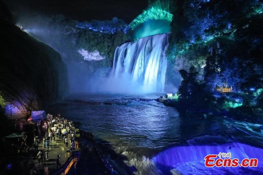 A 3D light show illuminates the Huangguoshu Waterfall in Anshun City, southwest China's Guizhou Province, Aug. 6, 2024. (Photo: China News Service/Qu Honglun)