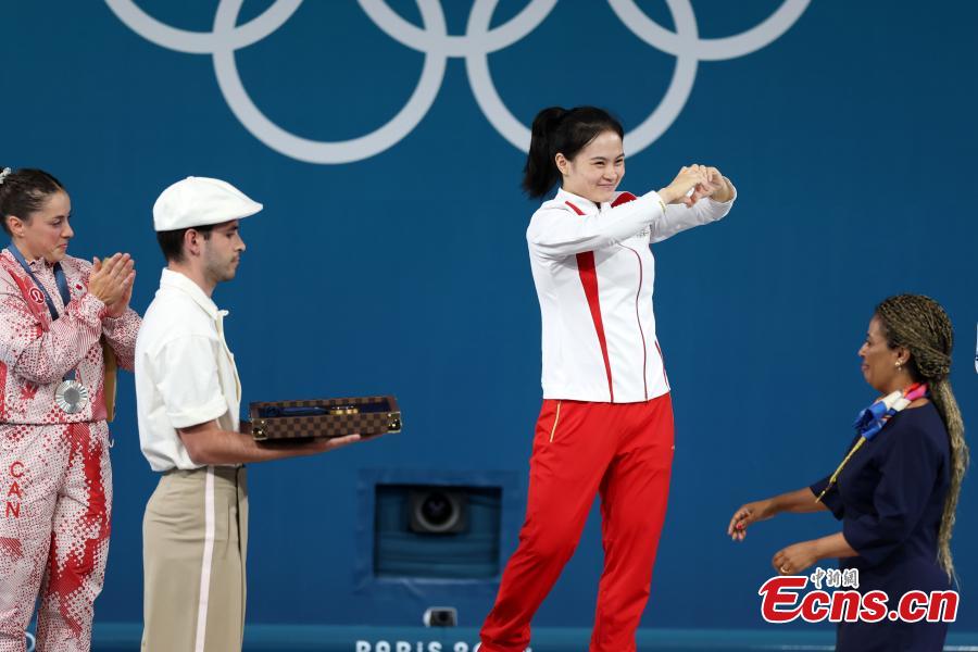 Luo Shifang of China celebrates during the awarding ceremony for women's 59kg weightlifting at the Paris 2024 Olympic Games in Paris, France, Aug. 8, 2024. (Photo: China News Service/Sheng Jiapeng)