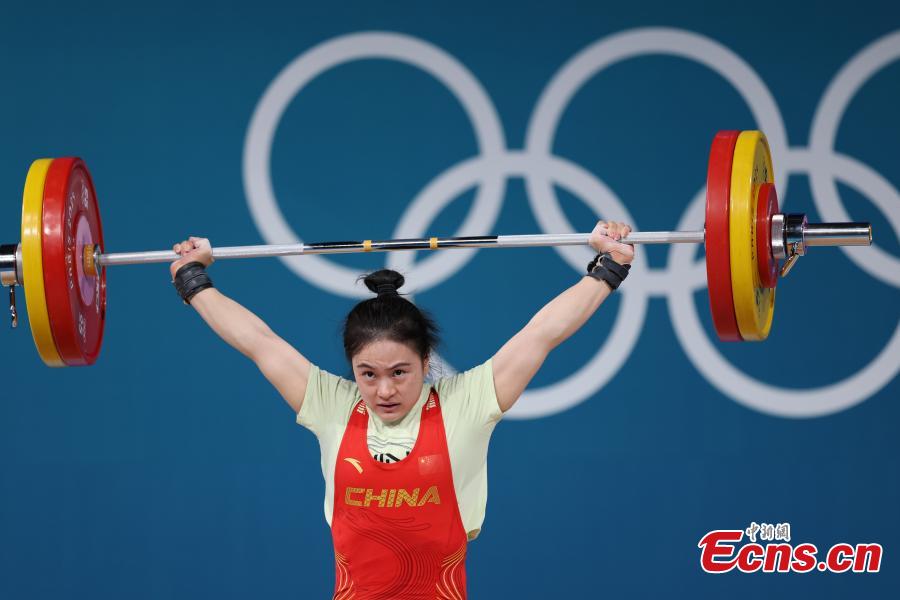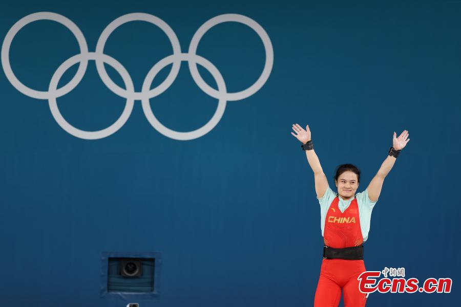 Luo Shifang of China competes during the women's 59kgweightlifting at the Paris 2024 Olympic Games in Paris, France, Aug. 8, 2024. (Photo: China News Service/Sheng Jiapeng)