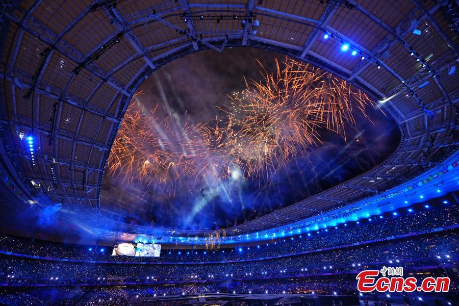 Fireworks explode during the closing ceremony of the Paris 2024 Olympic Games at the Stade de France in Paris, France, Aug. 11, 2024. (Photo: China News Service/Zhao Wenyu)