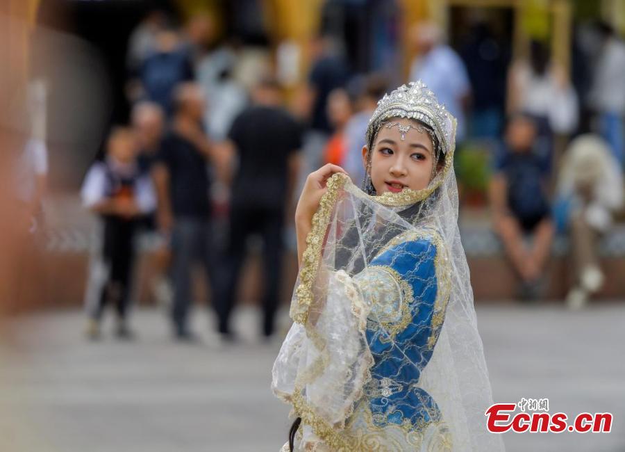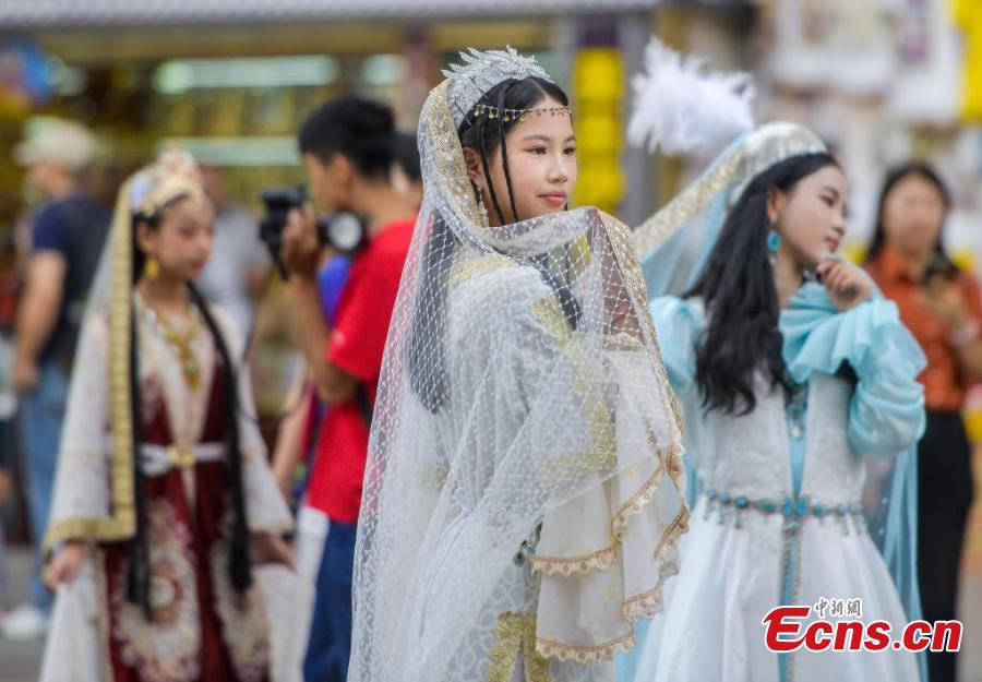 Tourists in exquisite ethnic Uyghur dresses pose for photos at Xinjiang International Grand Bazaar in Urumqi, northwest China's Xinjiang Uygur Autonomous Region, Aug. 12, 2024. (Photo: China News Service/Liu Xin)