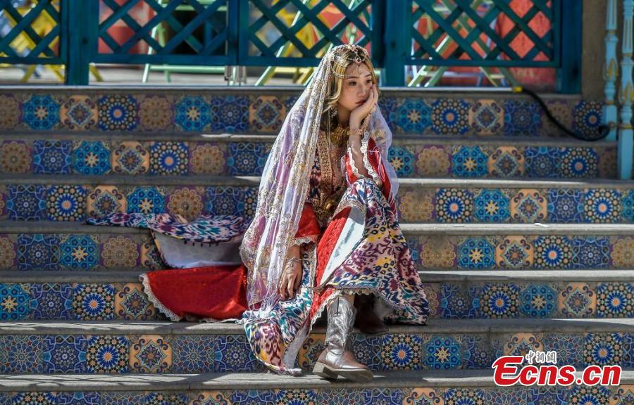 A woman in exquisite ethnic Uyghur dresses poses for photos at Xinjiang International Grand Bazaar in Urumqi, northwest China's Xinjiang Uygur Autonomous Region, Aug. 12, 2024. (Photo: China News Service/Liu Xin)