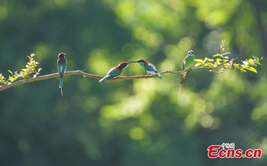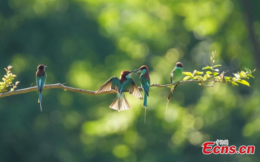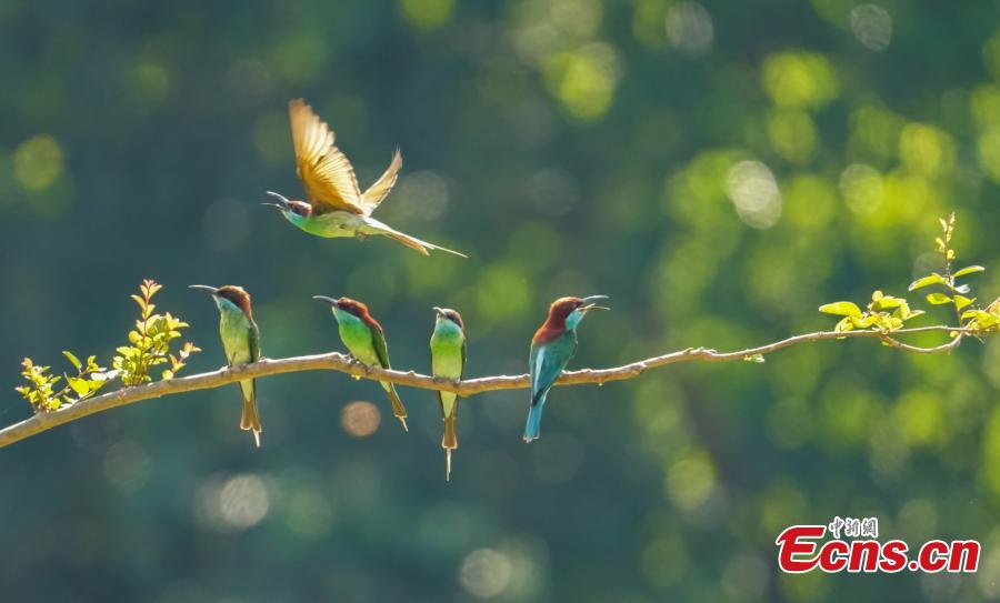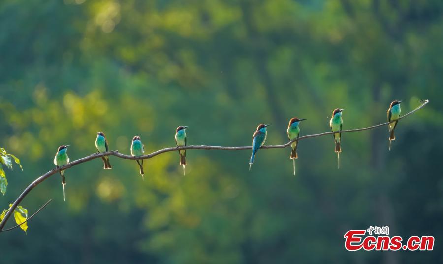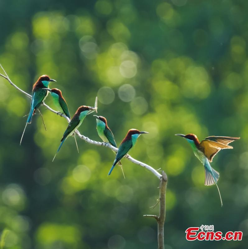 A group of blue-throated bee-eaters rest on a withered branch in Huanggang, central China's Hubei Province, Aug. 13, 2024. (Photo/VCG)