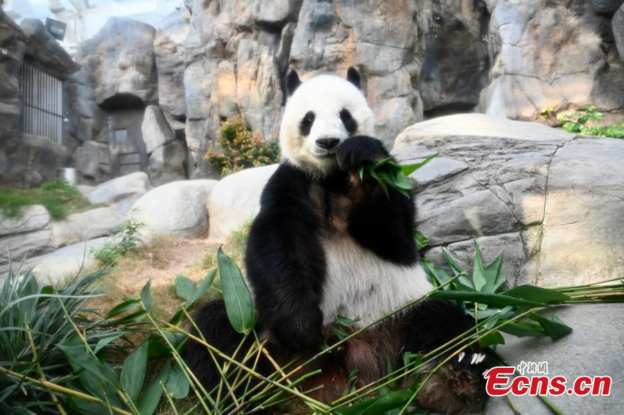File photo shows giant panda Le Le eating bamboo at Ocean Park, the Hong Kong Special Administrative Region. (Photo: China News Service/Li Zhihua)