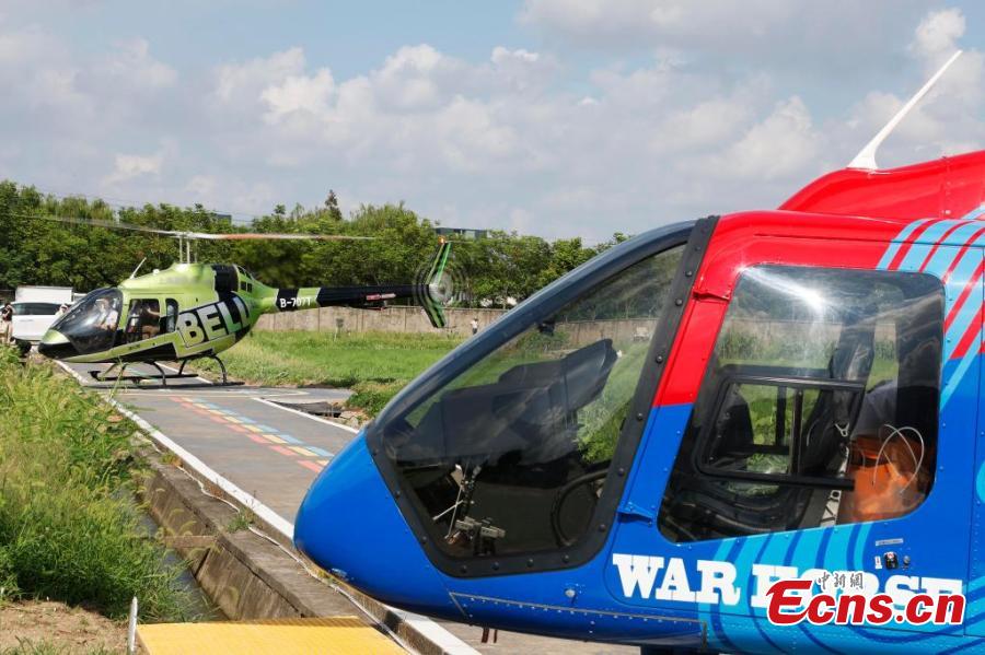 Two helicopters land at the Xingye aviation base in Pudong, Shanghai, Aug. 18, 2024. (Photo: China News Network/Yin Liqin)