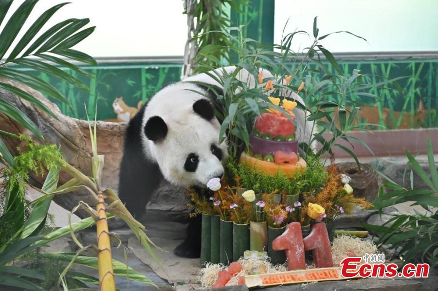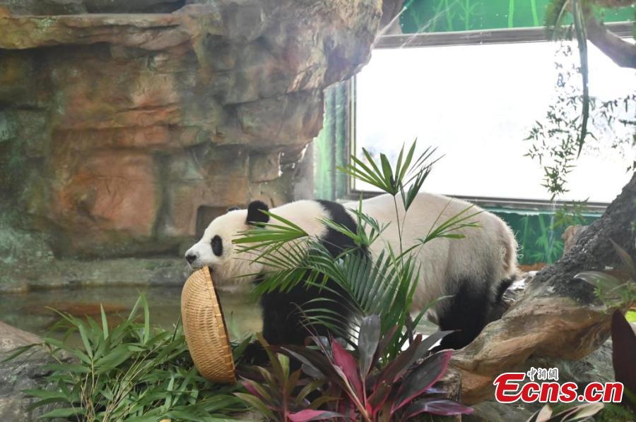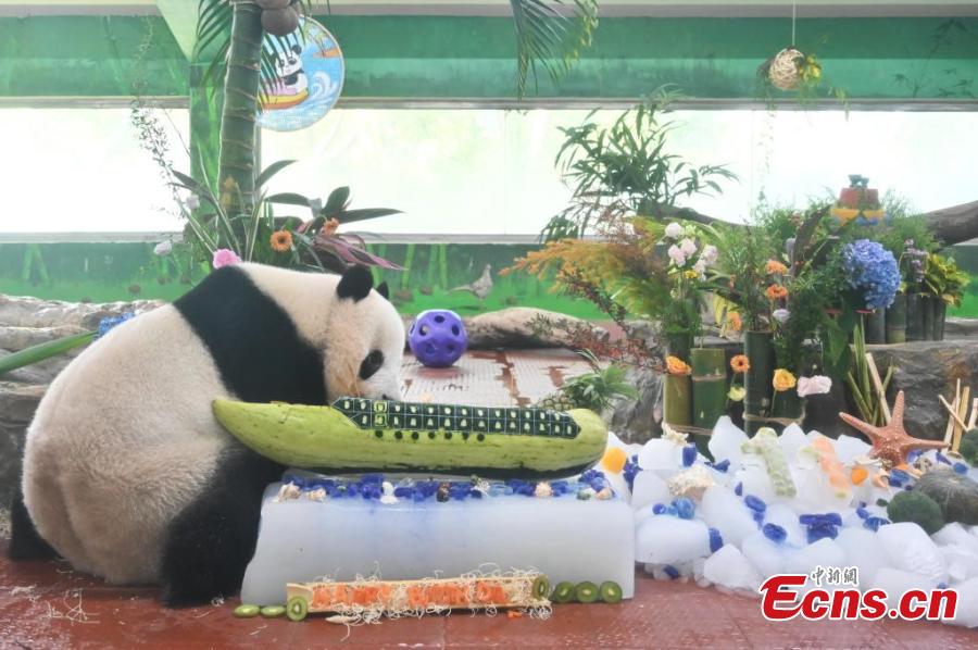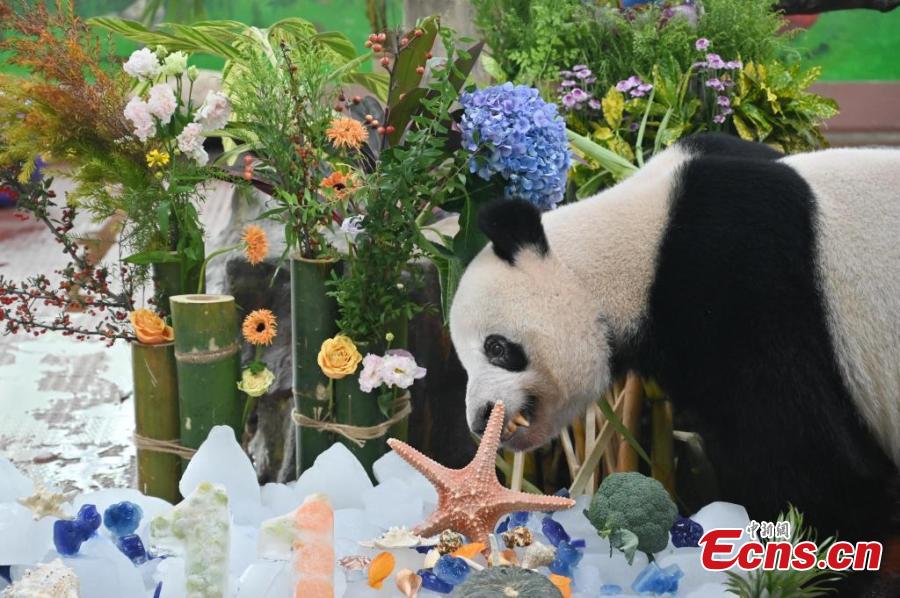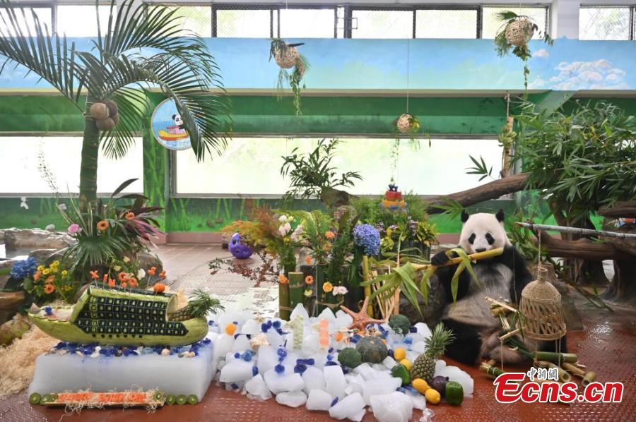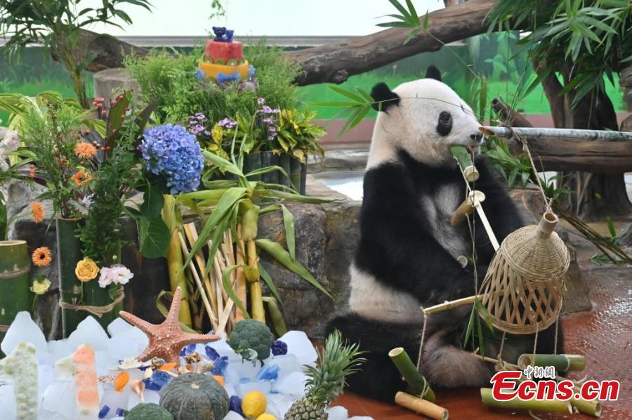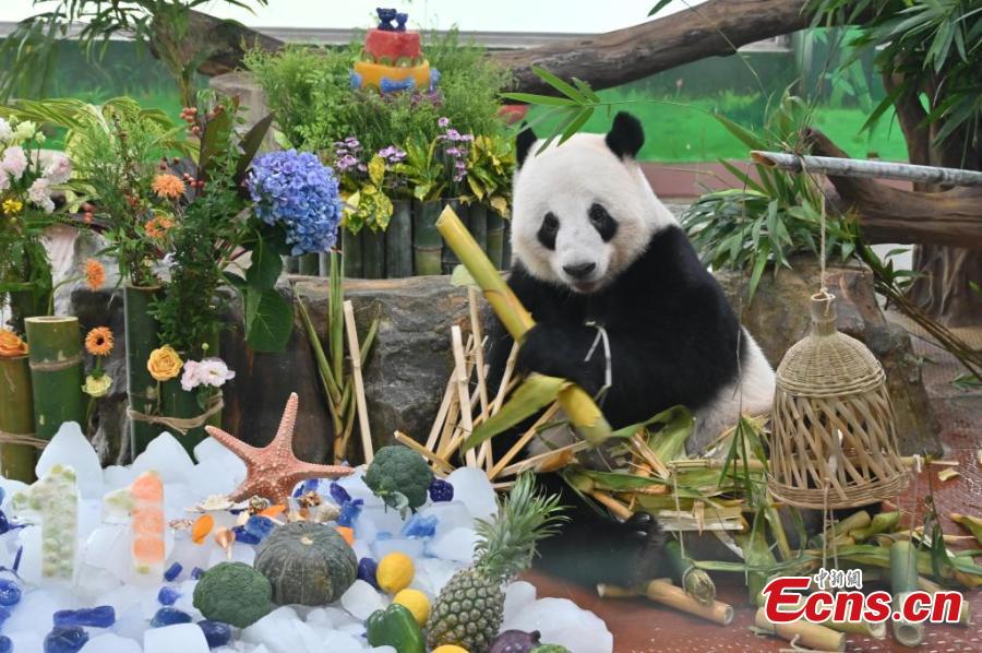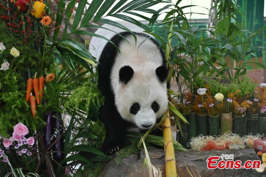A giant panda enjoys bamboo during a birthday celebration at Guangzhou Zoo in south China's Guangdong Province, Aug. 27, 2024. (Photo: China News Service/Chen Chuhong)