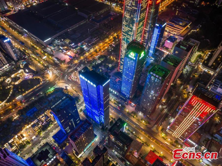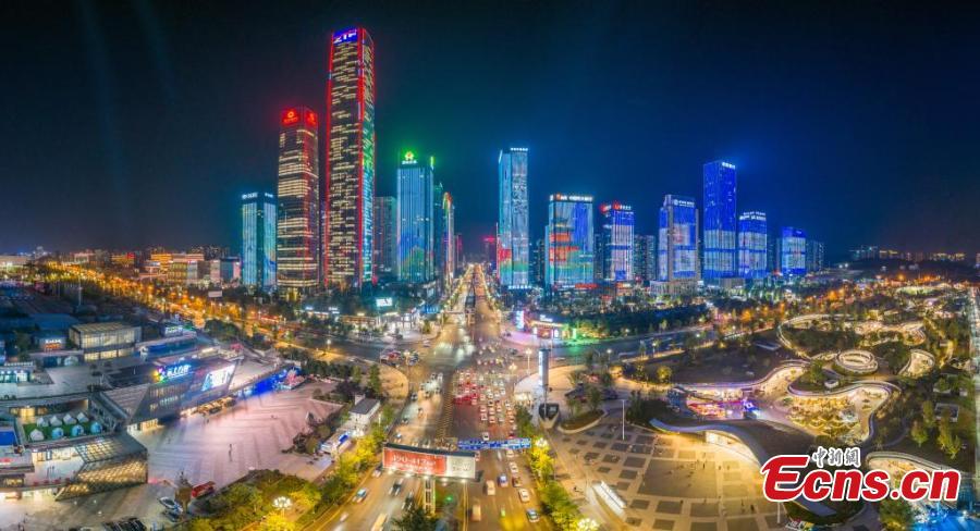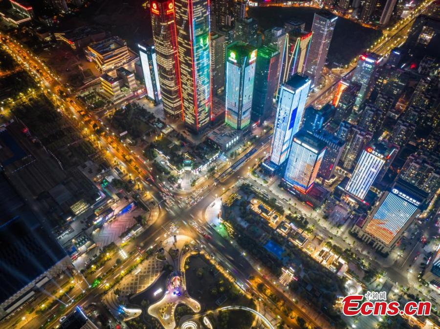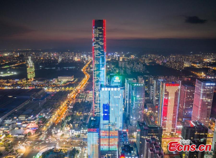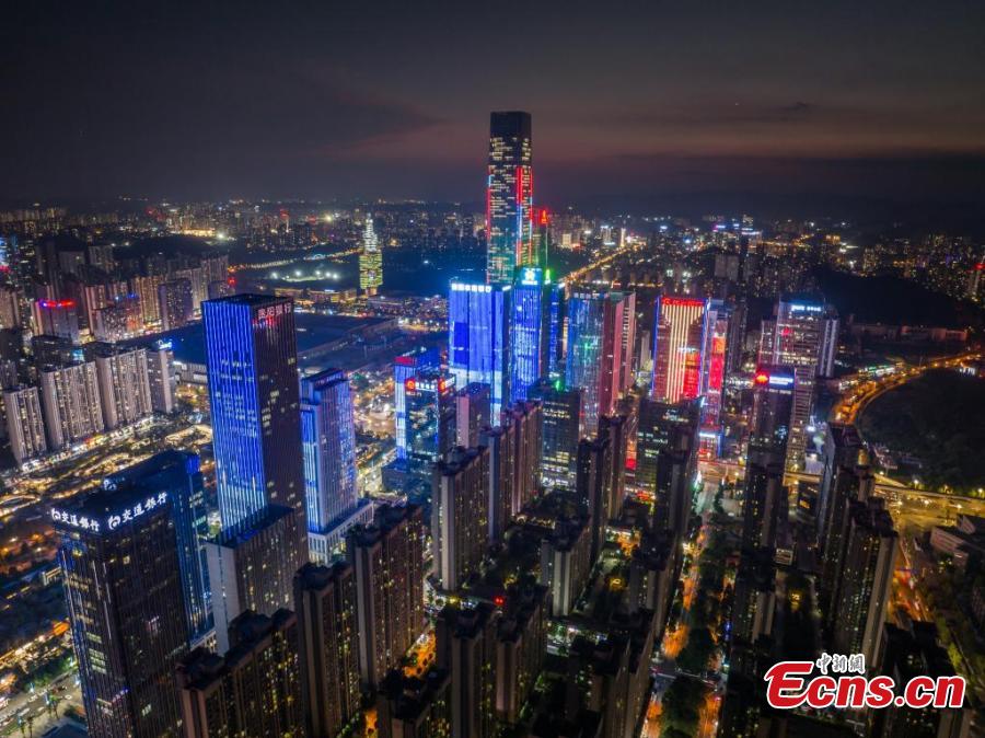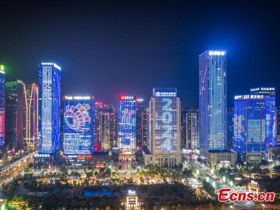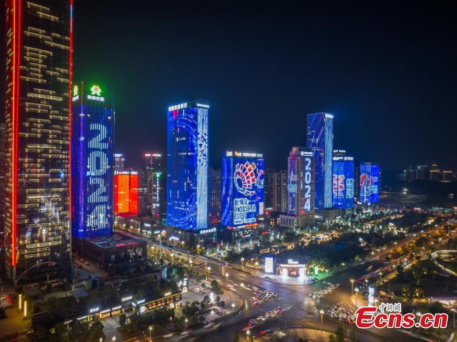 Lightshow is staged on the landmark buildings to greet the China International Big Data Industry Expo 2024 in Guiyang, southwest China's Guizhou Province, Aug. 28, 2024. (Photo: China News Service/Tang Zhe)