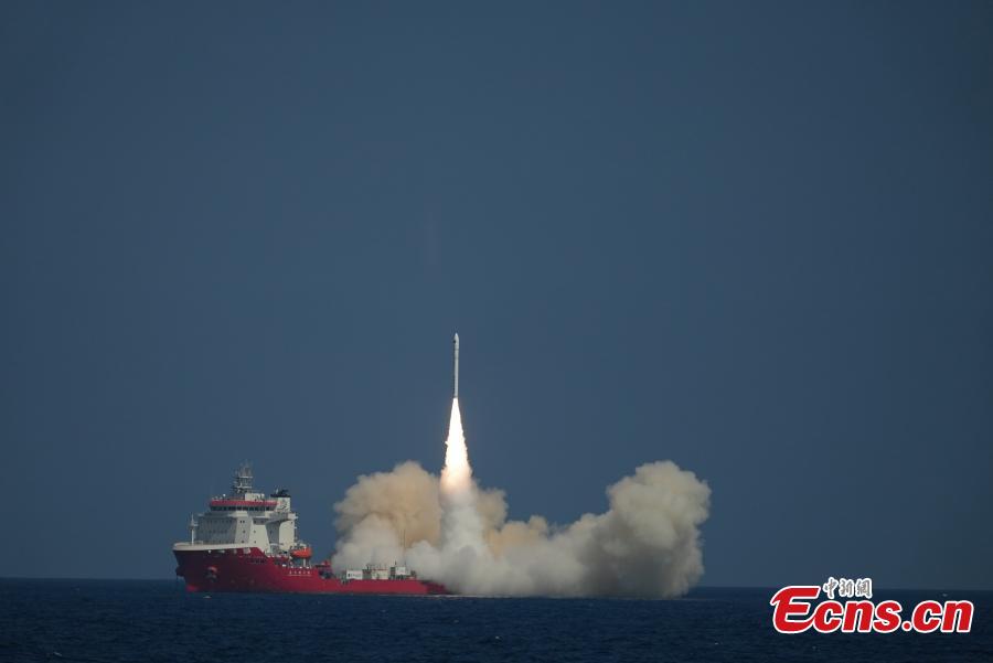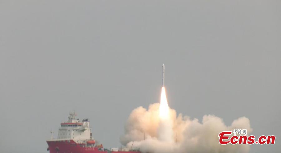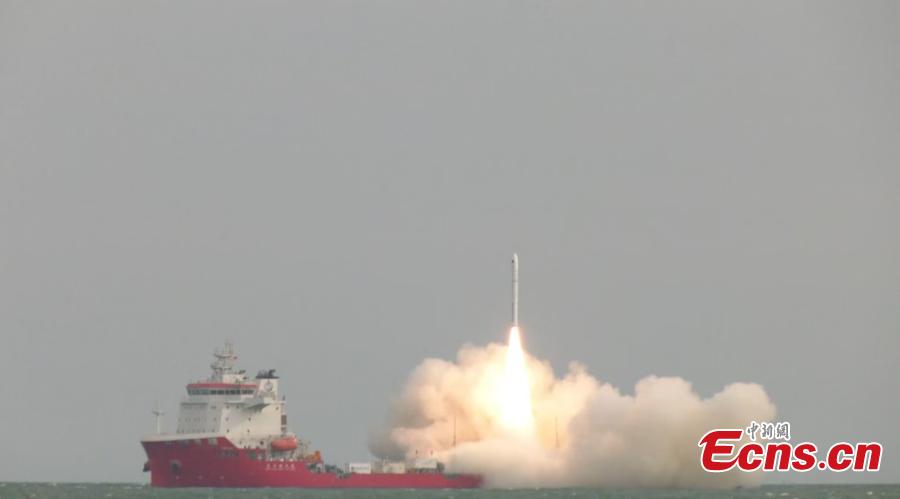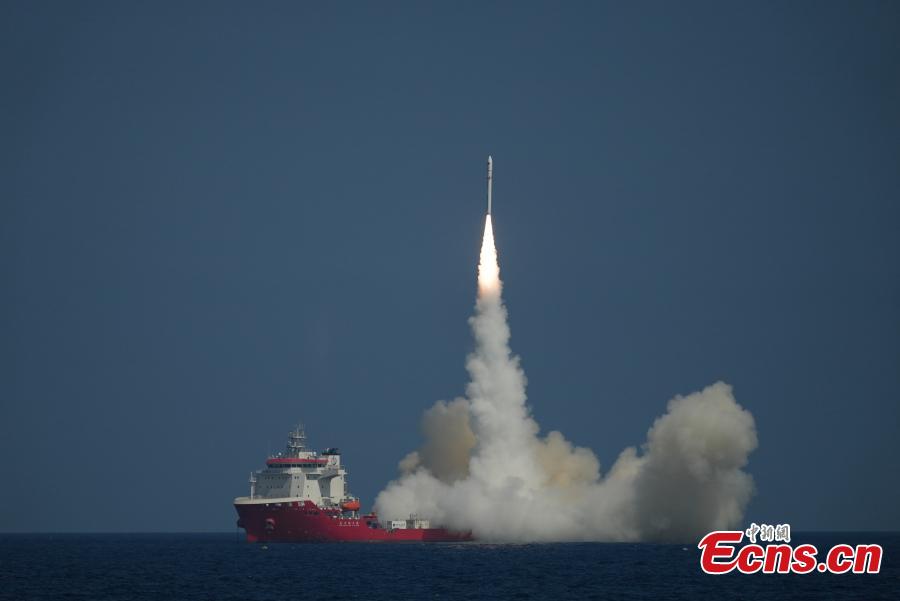 A CERES-1 carrier rocket carrying six satellites carrying Yunyao-1 15, 16 and 17 satellites and three other satellites blasts off from the waters near east China's Shandong Province, Aug. 29, 2024. (Photo: China News Service/Ran Jie)