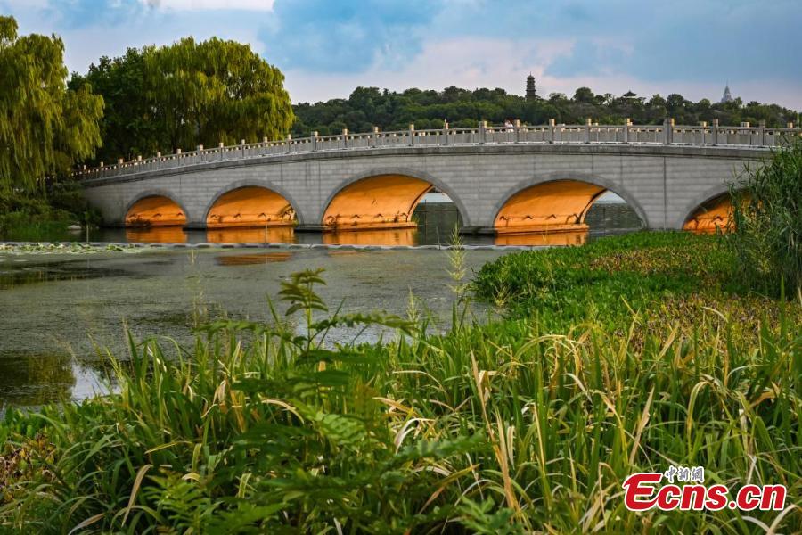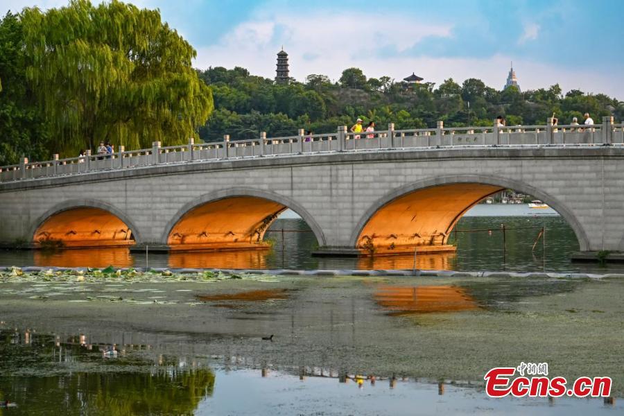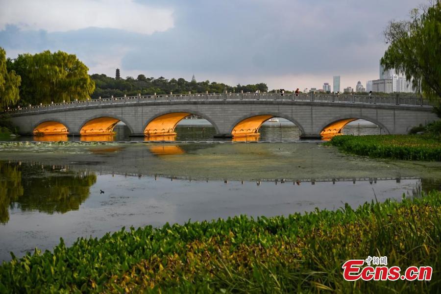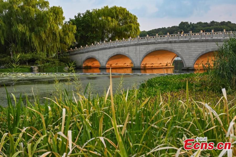 Scenery of Zhong Yu Bridge with sunset glow shining through its holes on Xuanwu Lake in Nanjing, east China's Jiangsu Province, Aug. 29, 2024. (Photo: China News Service/Yang Bo)