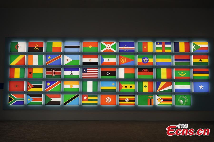 This photo taken on Sept. 5, 2024 shows the flags of the 53 African countries that have established diplomatic relations with China, as well as the flag of the African Union Commission, which were exhibited at the media center of the 2024 Summit of the Forum on China-Africa Cooperation (FOCAC) in Beijing. (Photo: China News Network/Zhao Li)