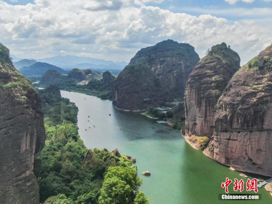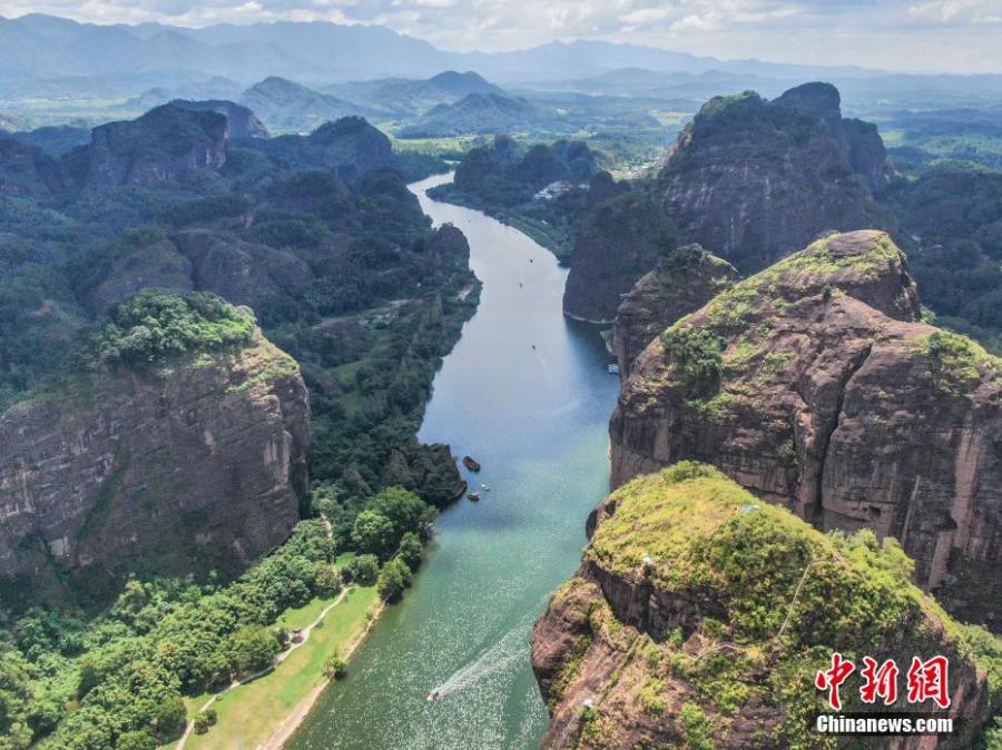 Arial view of Luxi River in Yingtan City, East China's Jiangxi Province on Sept. 7, 2024. The peaks of the Danxia landform, with their unique shapes, stand tall, while bamboo rafts drift on the azure waters, creating a picturesque scene. (Photo: China News Service/Liu Lixin)