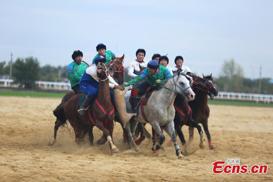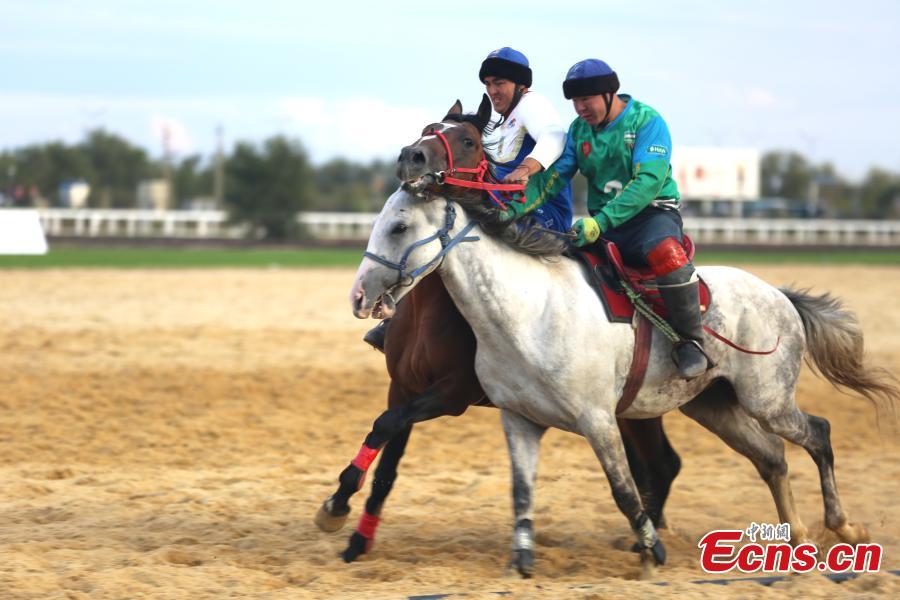 Competitors participate in sheep-scrambling competition during the 5th World Nomad Games held in Astana, Kazakhstan, Sept. 10, 2024. (Photo: China News Service/Shan Lu)