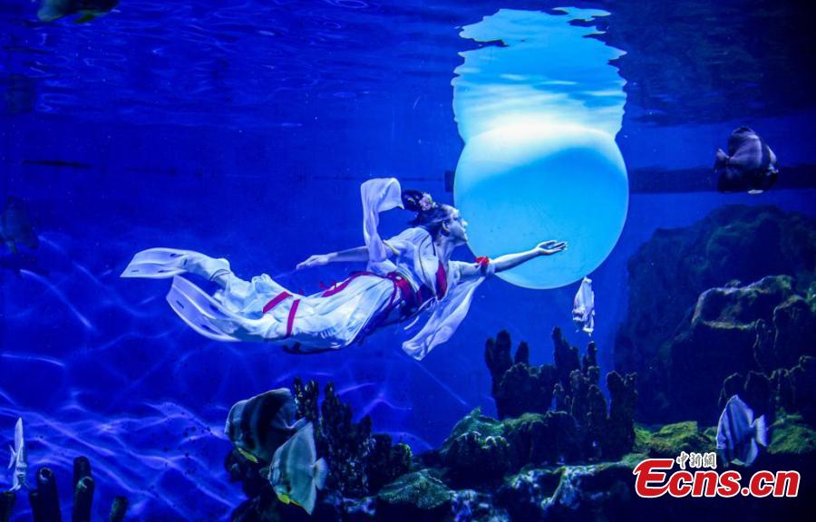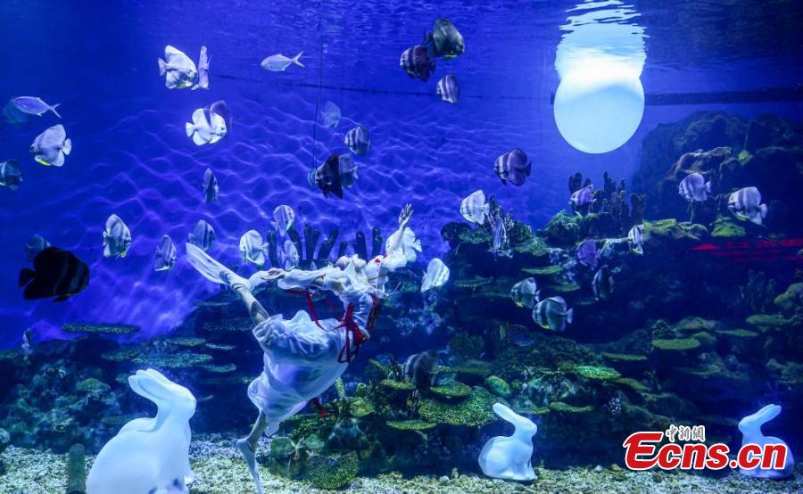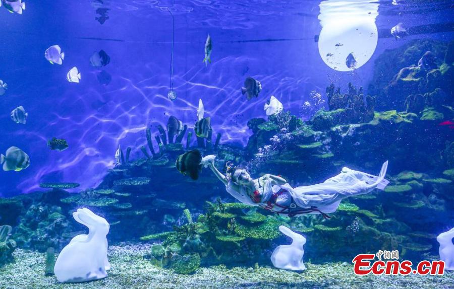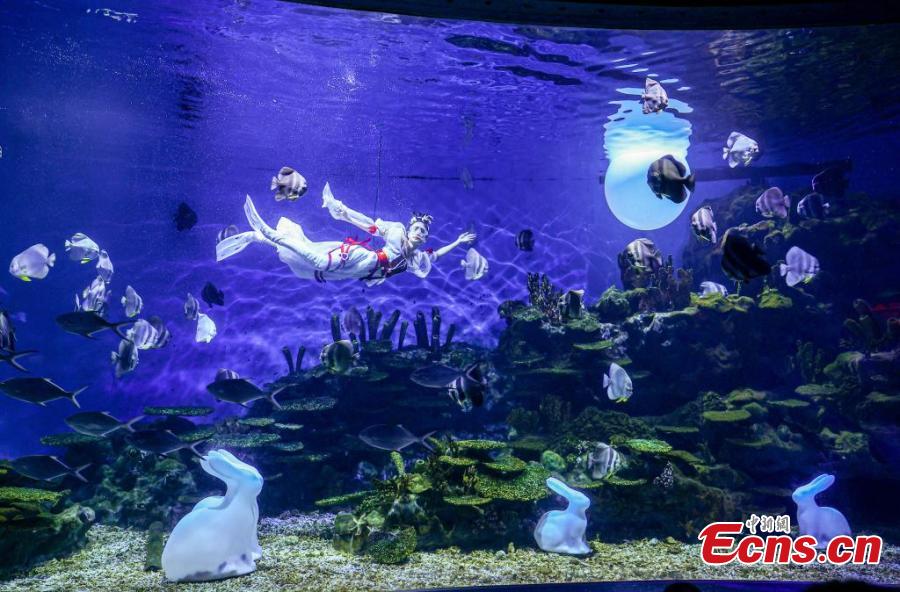 A stunning underwater performance "Lady Chang'e Flying to the Moon" is stage to greet the upcoming Mid-Autumn Festival at Haichang Ocean Park in Wuhan, central China's Hubei Province, Sept. 13, 2024. (Photo: China News Service/Zhang Chang)