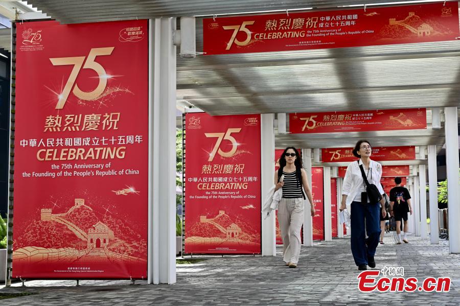 Posters themed on the 75th anniversary of the founding of the People's Republic of China are hung on a street in the Hong Kong Special Administrative Region (HKSAR), Sept. 17, 2024. (Photo: China News Service/ Li Zhihua)