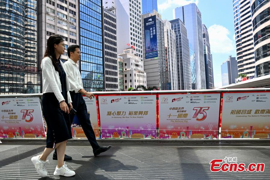 Posters themed on the 75th anniversary of the founding of the People's Republic of China are hoisted on a flyover in the Hong Kong Special Administrative Region (HKSAR), Sept. 17, 2024. (Photo: China News Service/ Li Zhihua)