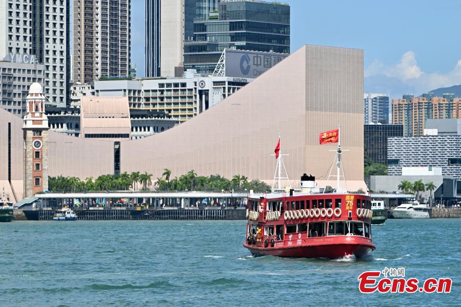 A Star Ferry decorated to mark the 75th anniversary of the founding of the People's Republic of China sails at the Victoria Harbor in the Hong Kong Special Administrative Region (HKSAR), Sept. 17, 2024. (Photo: China News Service/ Li Zhihua)