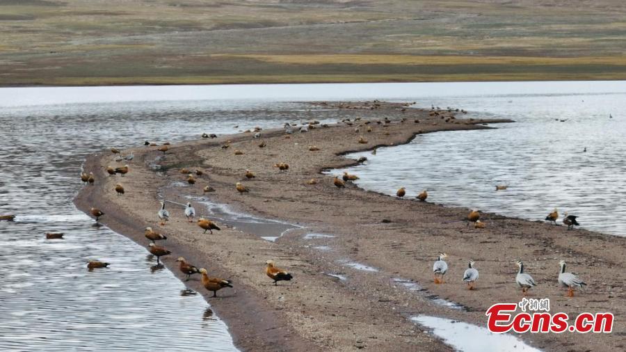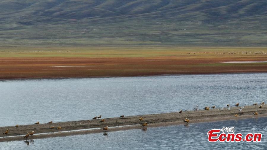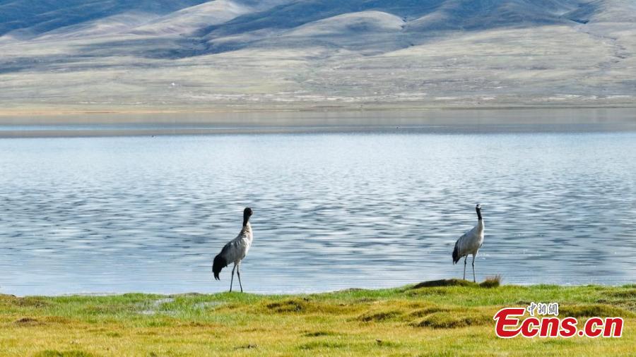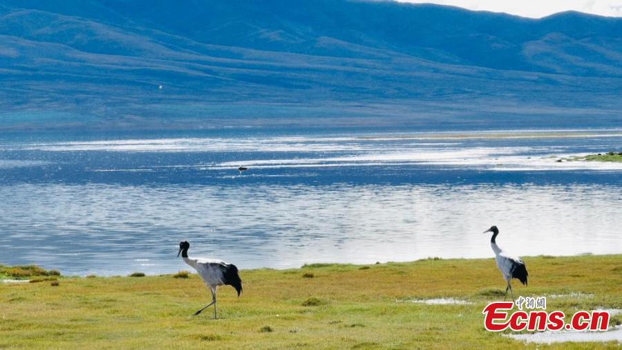 Black-necked cranes wander at the Arak Lake National Wetland Park, Dulan County, Haixi Autonomous Prefecture, northwest China's Qinghai Province, Sept. 18, 2024. (Photo: China News Service/Xian Gong)