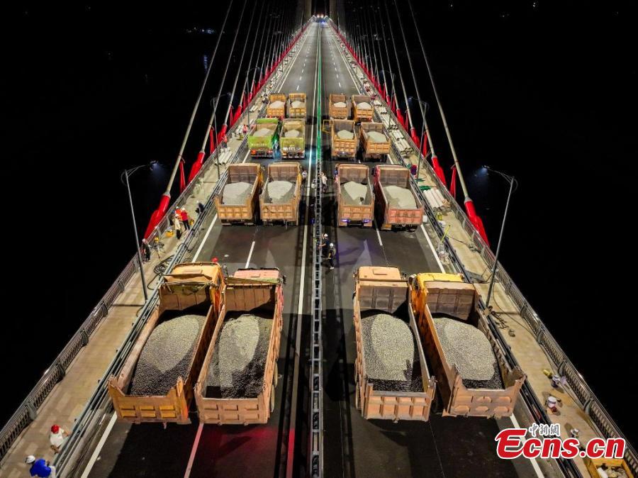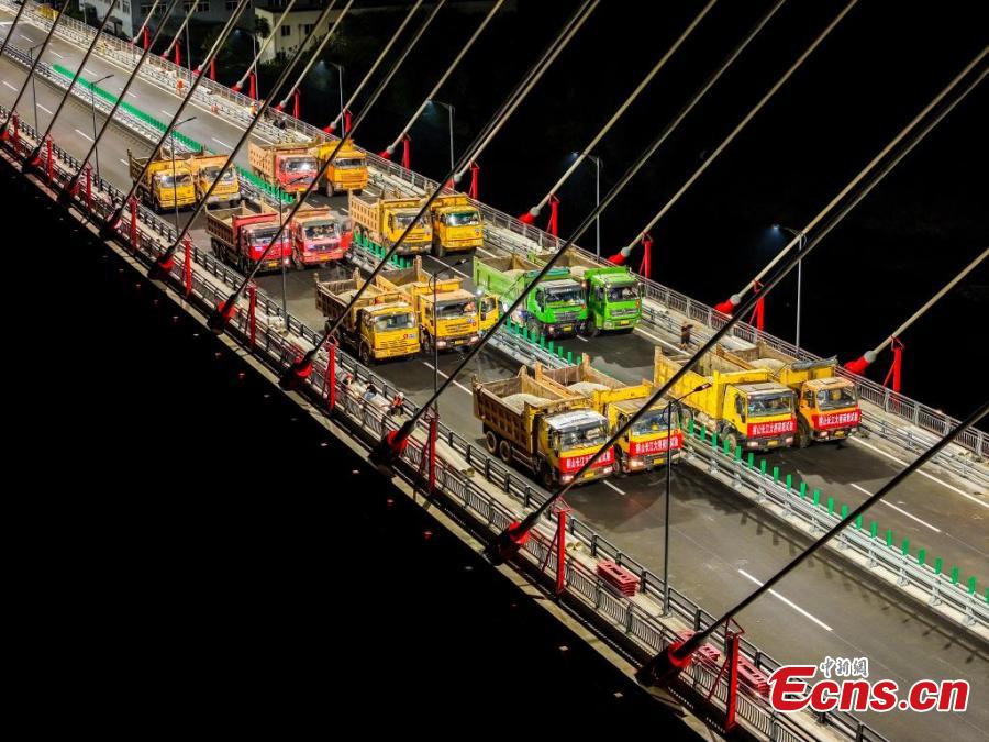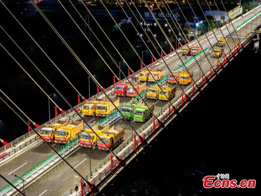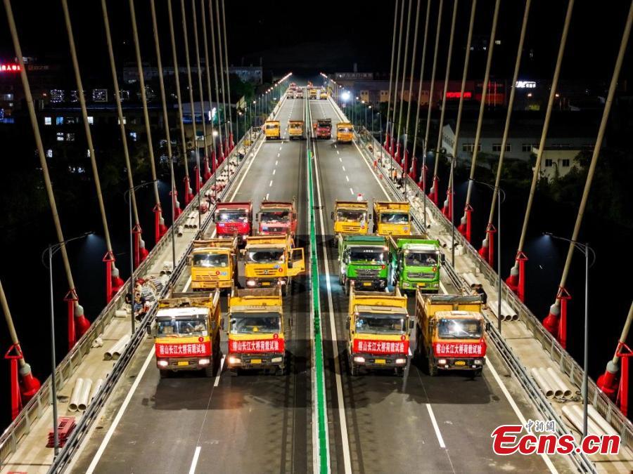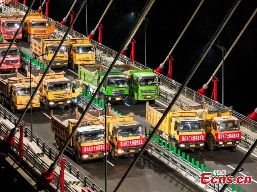 Trucks loaded with goods park on the Rongshan Yangtze River Bridge to conduct static load testing in Hejiang County of Luzhou City, southwest China's Sichuan Province, Sept. 19, 2024. (Photo: China News Service/Li Guiping)