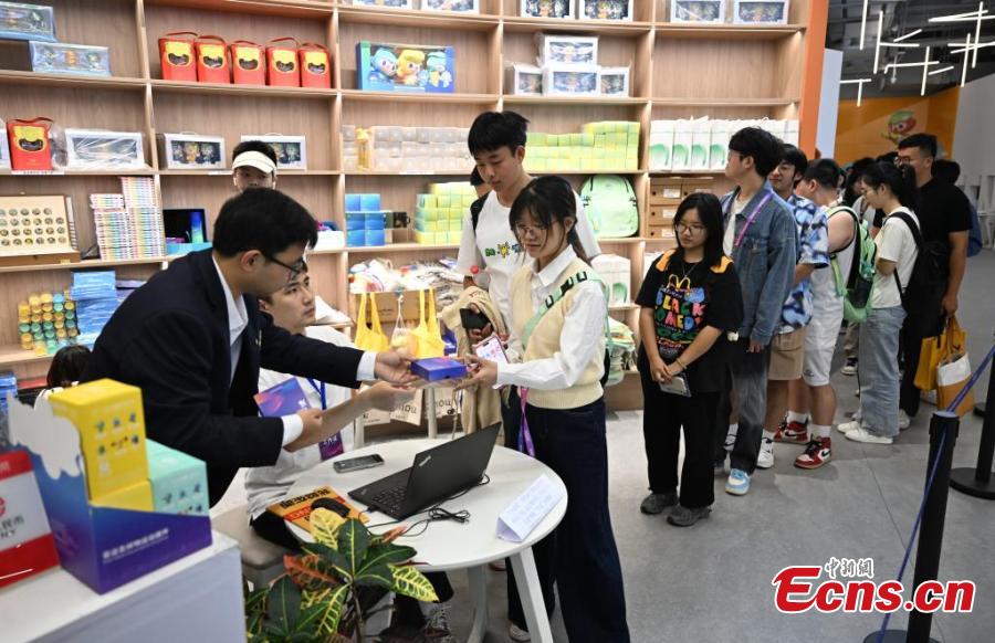 Volunteers for the Hangzhou Asian Games receive souvenirs during a special exhibition to mark the one year anniversary of the Hangzhou Asian Games in Hangzhou, east China's Zhejiang Province, Sept. 23, 2024. (Photo: China News Service/Wang Gang)
