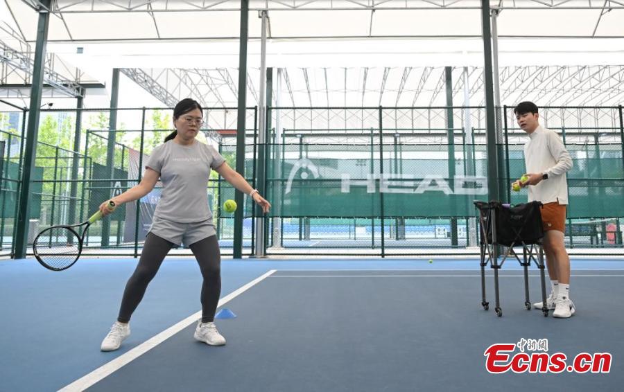 People play tennis at the Hangzhou Olympic Sports Center to mark the one year anniversary of the Hangzhou Asian Games, in east China's Zhejiang Province, Sept. 23, 2024. (Photo: China News Service/Wang Gang)
