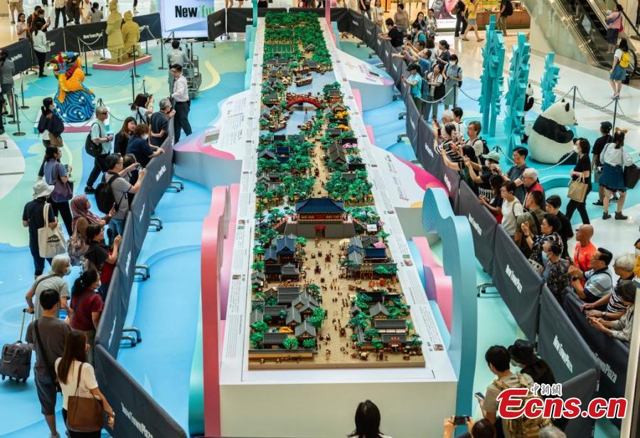 The 26-meter-long Lego version of the Chinese painting "Along the River During the Qingming Festival," also known by its Chinese name "Qingming Shanghe Tu," a masterpiece that depicts the lives of people along the Bian River during the Song Dynasty (960-1279) over 800 years ago, was made with 3 million pieces of Lego bricks. It was recognized by Guinness World Records as the "largest LEGO three-dimensional scene model." The display aims to promote Chinese history and culture ahead of 75th anniversary of the founding of the People's Republic of China.