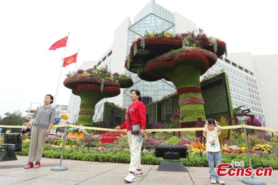 People pose for photos in front of a floral display on the Chang'an Avenue to celebrate the upcoming National Day in Beijing, Sept. 28, 2024. (Photo: China News Service/Zhang Xiangyi)