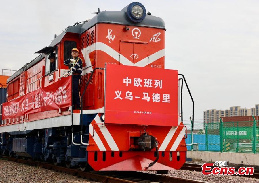 A freight train loaded with export goods from Yiwu in east China's Zhejiang Province heads for Madrid in Spain, Nov. 18, 2024. (Photo: China News Service/Dong Yixin)