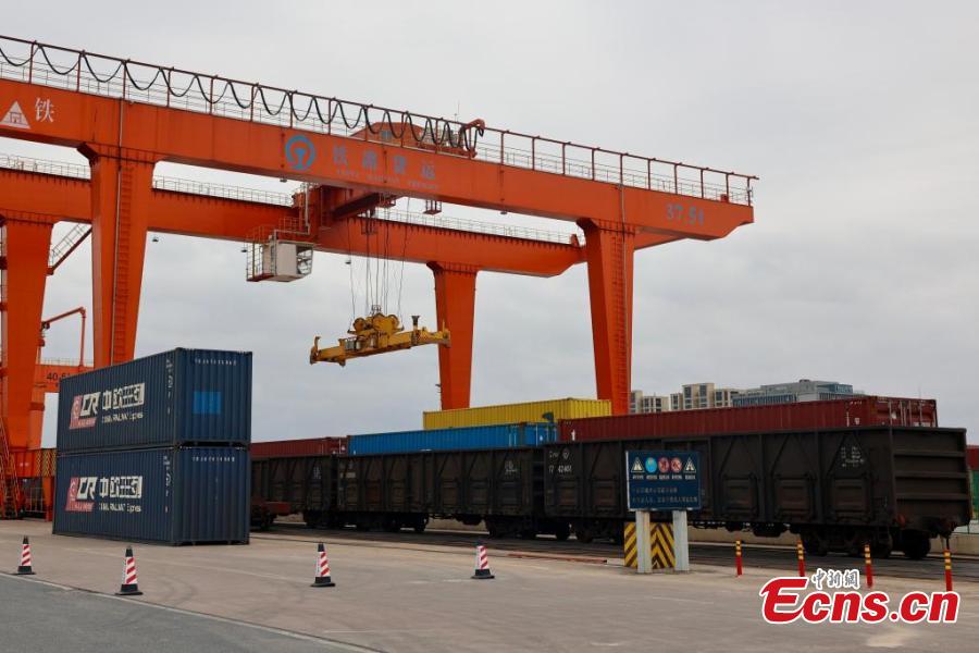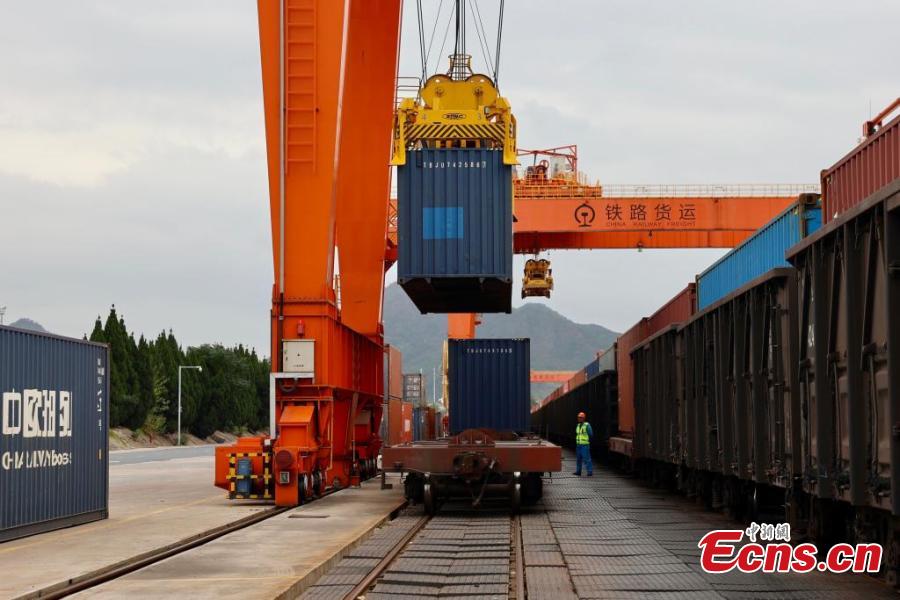 Containers are loaded onto a freight train at Yiwu West Railway Station in eastChina's Zhejiang Province, Nov. 18, 2024. (Photo: China News Service/Dong Yixin)