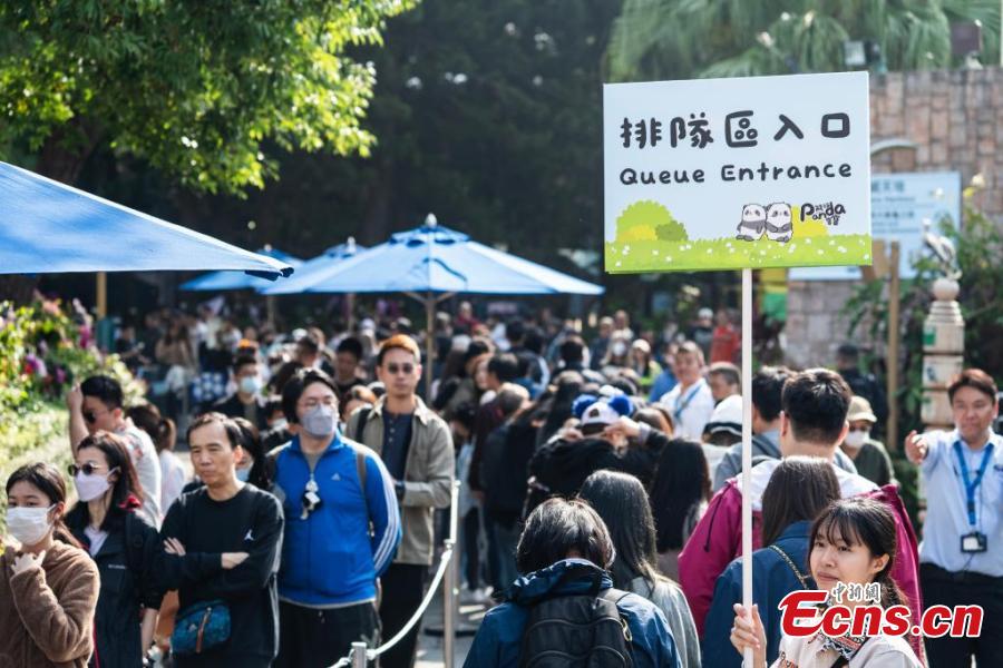 Visitors line up to view giant panda cubs at Ocean Park in the Hong Kong Special Administrative Region, Feb. 16, 2025. (Photo: China News Service/Hou Yu)