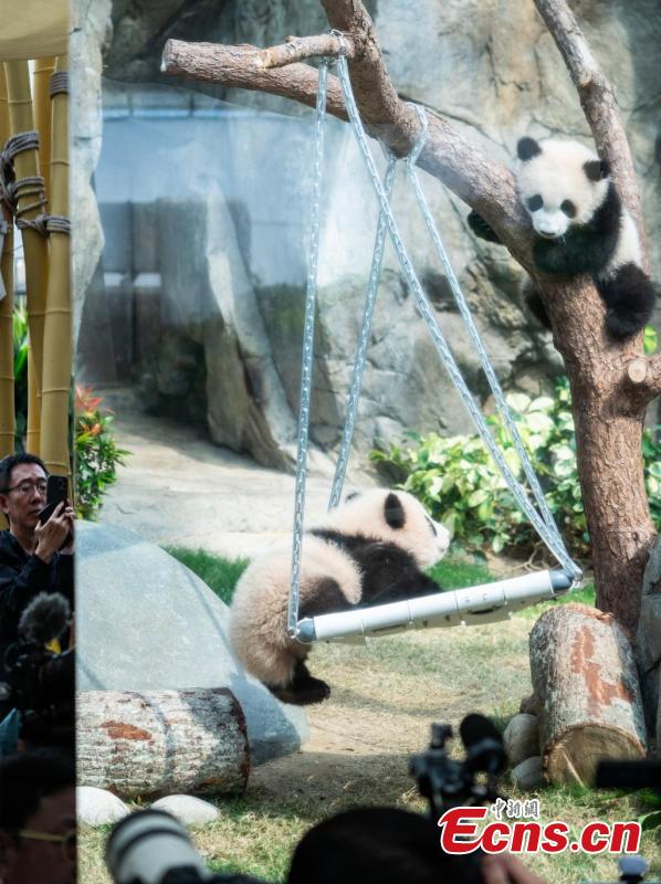 Panda twins “Gaaze” (elder sister in Cantonese) and “Sailou” (little brother) play at Ocean Park in the Hong Kong Special Administrative Region, Feb. 15, 2025. (Photo: China News Service/Hou Yu)