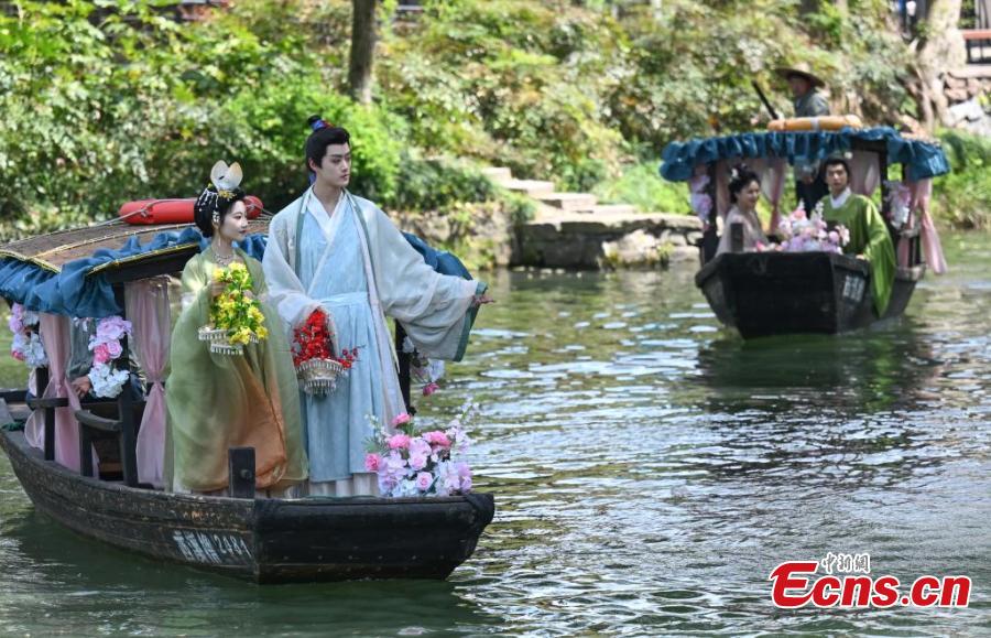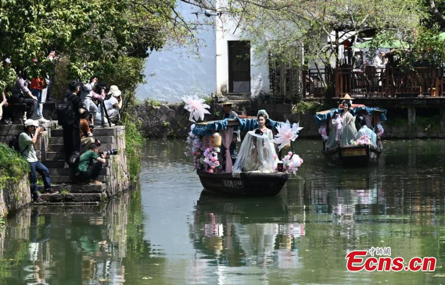 A boat parade is held during a celebration for the Huazhao Festival in Xixi Wetland, Hangzhou, east China's Zhejiang Province, March 24, 2025. (Photo: China News Service/Wang Gang)