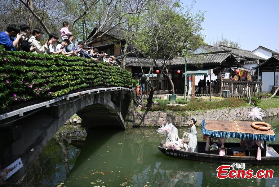 An opera actor performs amid blooming flowers during a celebration for the Huazhao Festival in Xixi Wetland, Hangzhou, east China's Zhejiang Province, March 24, 2025. (Photo: China News Service/Wang Gang)