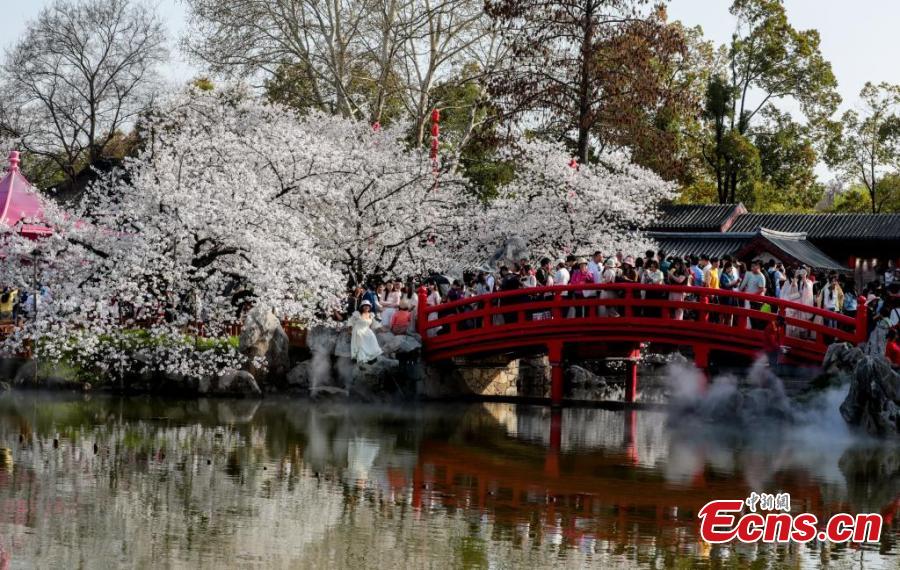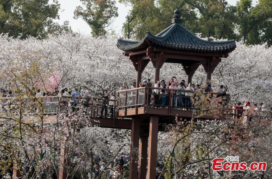 Cherry blossoms are in full bloom, drawing many visitors at East Lake Park in Wuhan, central China's Hubei Province, March 24, 2025. (Photo: China News Service/Zhang Chang)