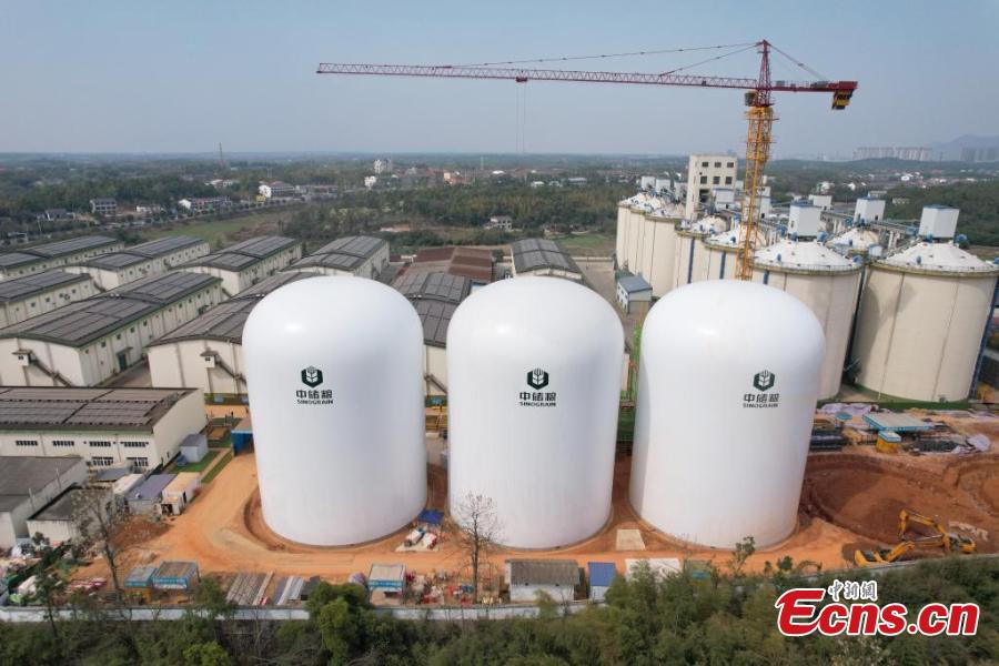 China's first batch of three large inflatable grain silos, with a storage capacity of 9,000 metric tons each, was installed on Monday. Standing at a height of 33 meters with a diameter of 24 meters, each air film silo offers a 20 percent increase in storage capacity compared to the previous generation.