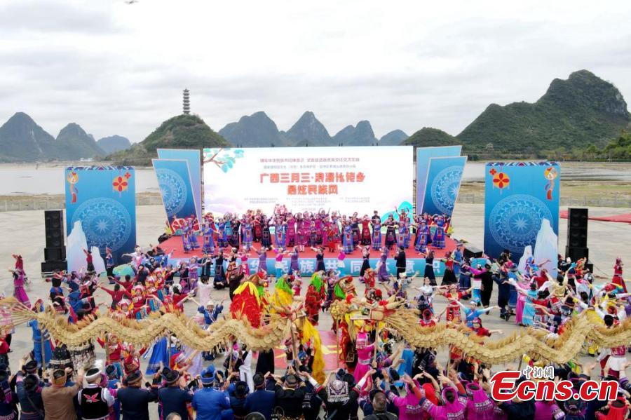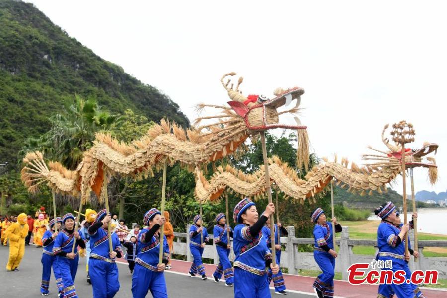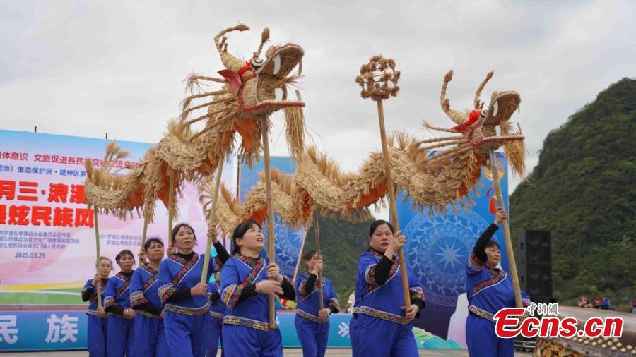 Villagers perform dragon dance to greet the Sanyunsan Festival in Luocheng Mulam Autonomous County, south China's Guangxi Zhuang Autonomous Region, March 29, 2025. (Photo: China News Service/Liao Guangfu)