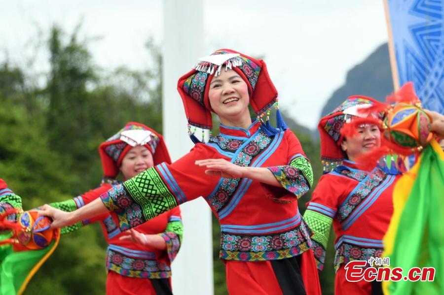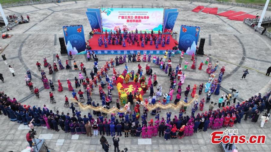 Villagers dance to greet the Sanyunsan Festivalin Luocheng Mulam Autonomous County, south China's Guangxi Zhuang Autonomous Region, March 29, 2025. (Photo: China News Service/Liao Guangfu)