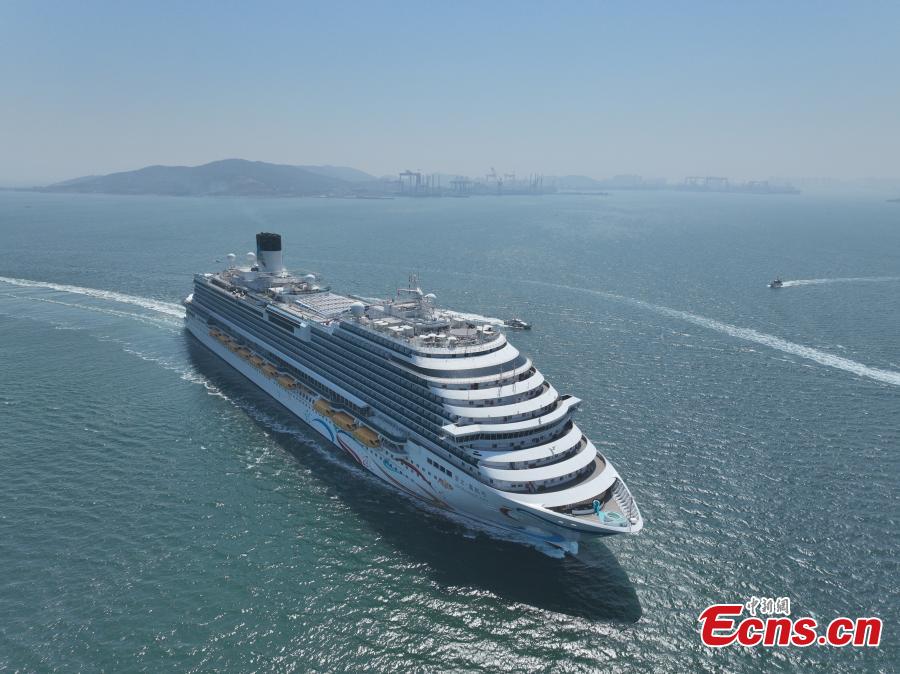 Adora Magic City, China's first domestically built cruise ship,arrives at the Qingdao International Cruise Terminal, east China's Shandong Province, April 6, 2025. (Photo provided to China News Service)