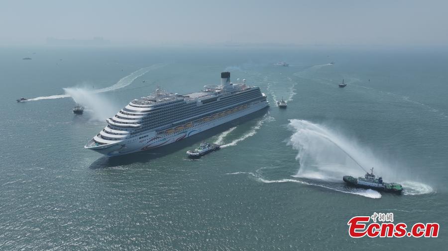 Adora Magic City, China's first domestically built cruise ship,passes through the water gate upon arrival at the Qingdao International Cruise Terminal, east China's Shandong Province, April 6, 2025. (Photo provided to China News Service)