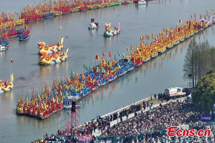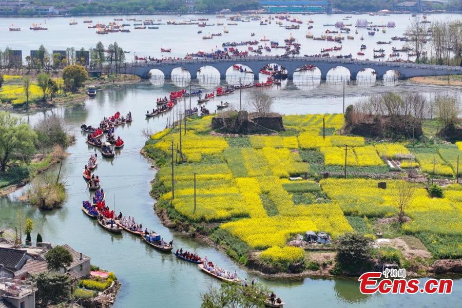 Boats sail to celebrate the 2025 Qintong Boat Festival at the Qinhu Natioinal Wetland Park in Taizhou, east China's Jiangsu Province, April 6, 2025. (Photo: China News Service/Yang Bo)
