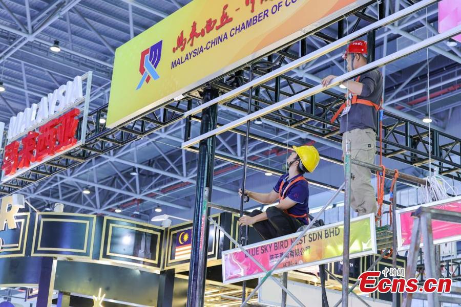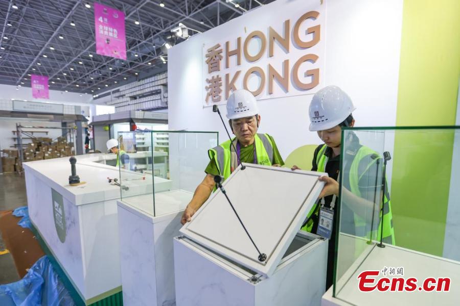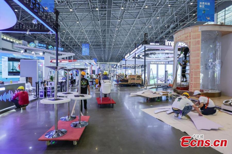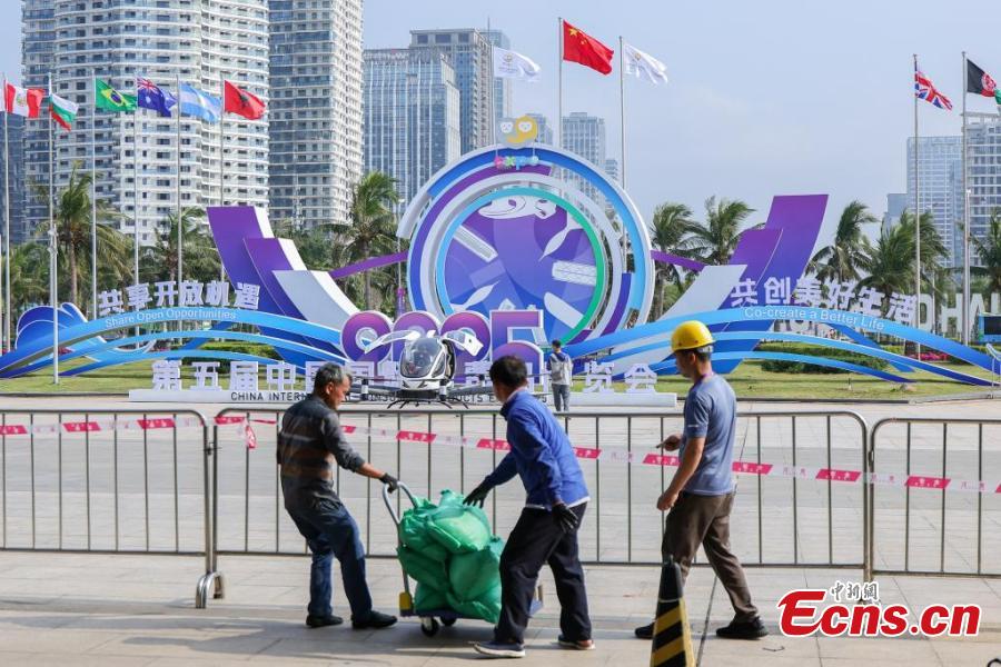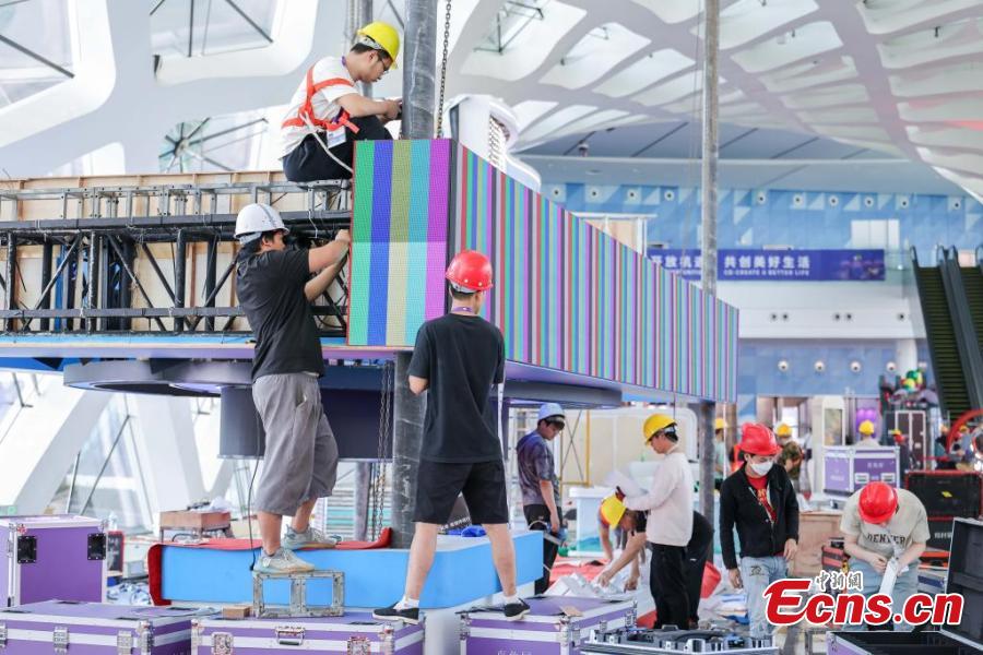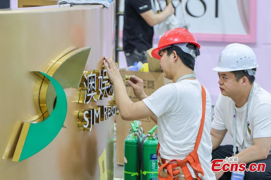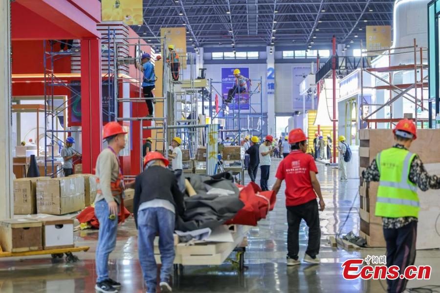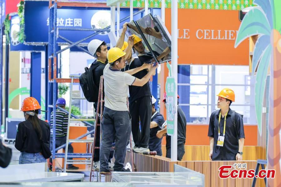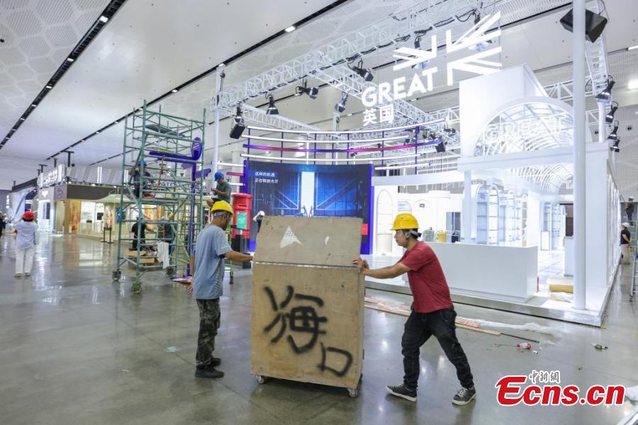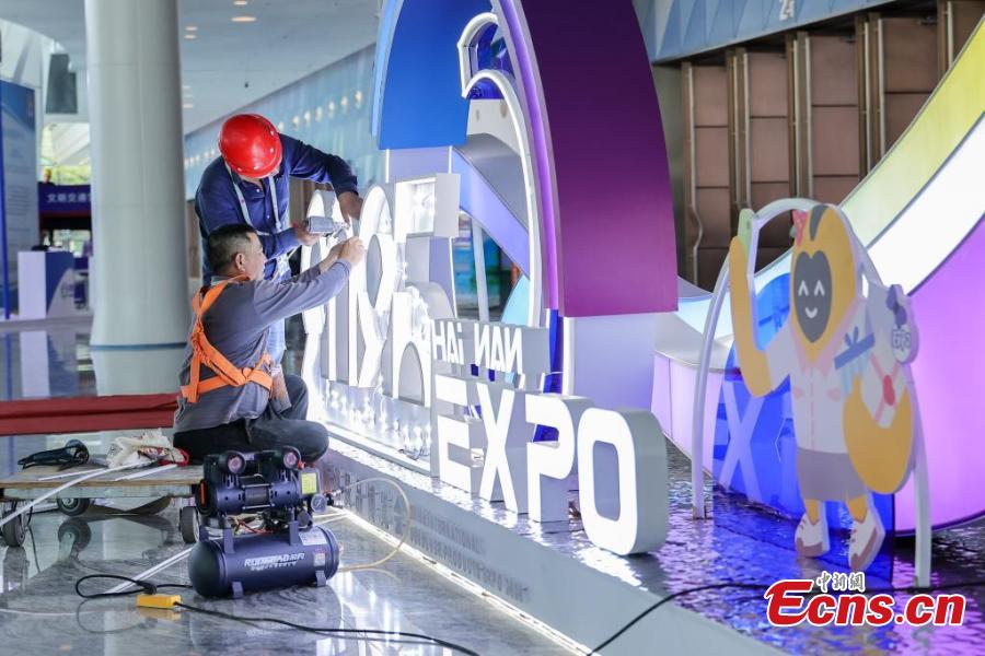 Technicians work at the Hainan International Convention and Exhibition Center, the main venue for the upcoming fifth China International Consumer Products Expo (CICPE), in Haikou, south China's Hainan Province, April 9, 2025. (Photo: China News Service/Luo Yunfei)