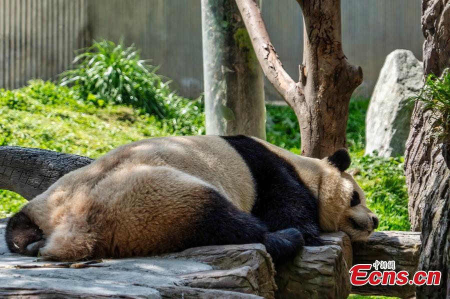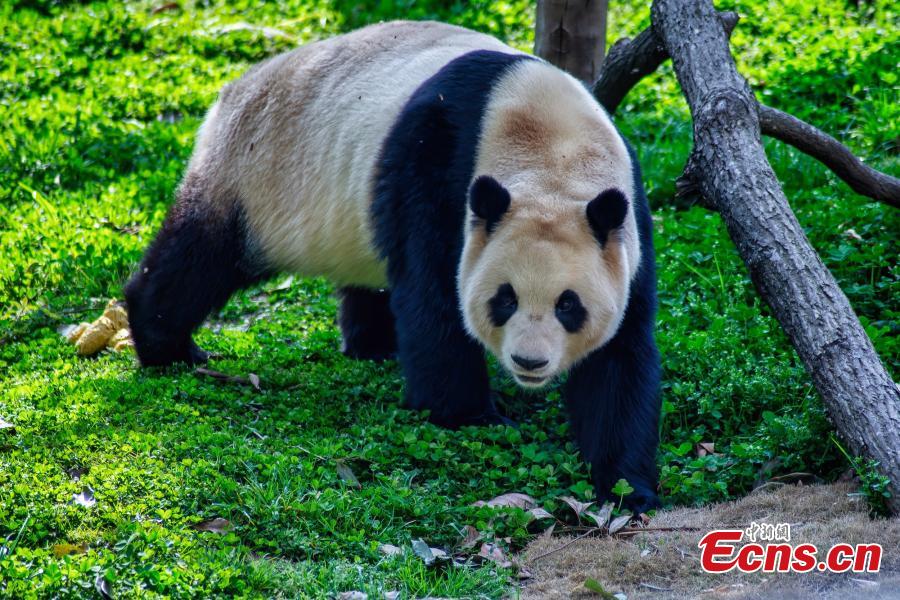 Giant panda Fu Bao plays at the Shenshuping base of the Wolong National Nature Reserve in Southwest China's Sichuan Province, April 9, 2025. (Photo/VCG)
