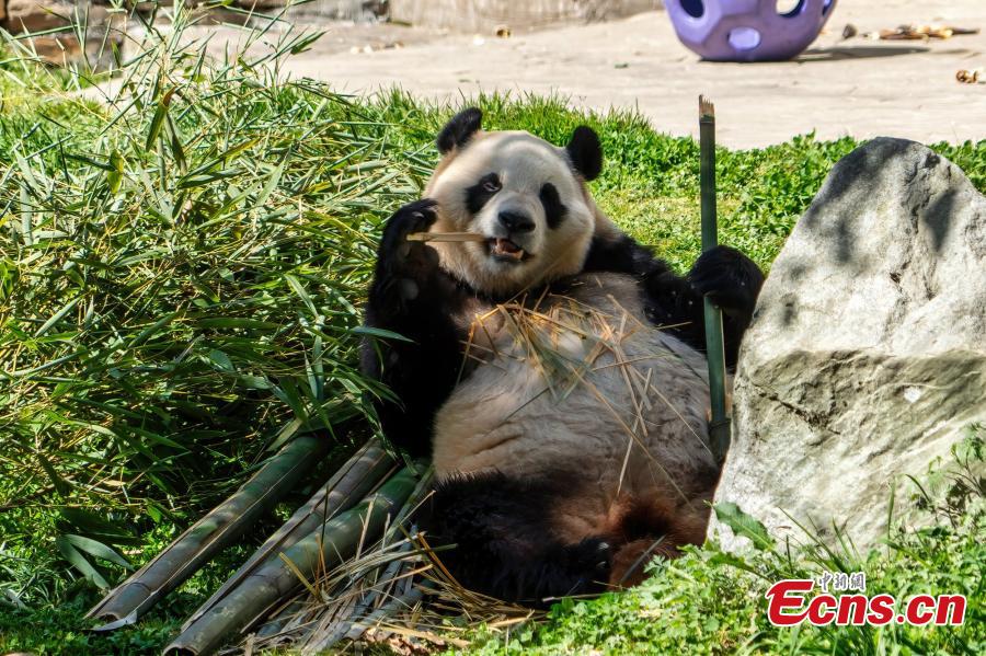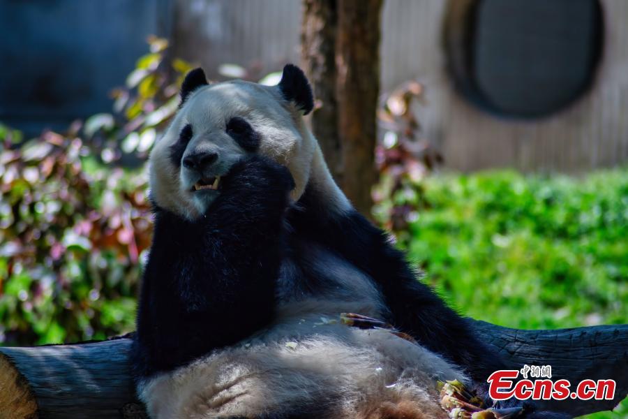 Giant panda Fu Bao eats bamboo at the Shenshuping base of the Wolong National Nature Reserve in Southwest China's Sichuan Province, April 9, 2025. (Photo/VCG)