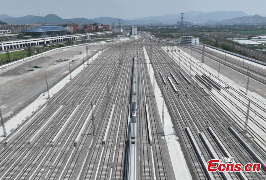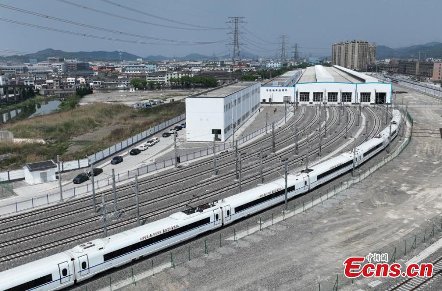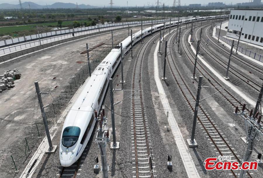 A high-speed train arrives at the Yongjin high-speed train base in Ningbo, east China's Zhejiang Province, April 9, 2025. (Photo: China News Service/Wang Gang)