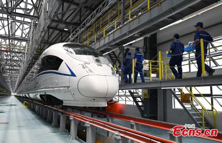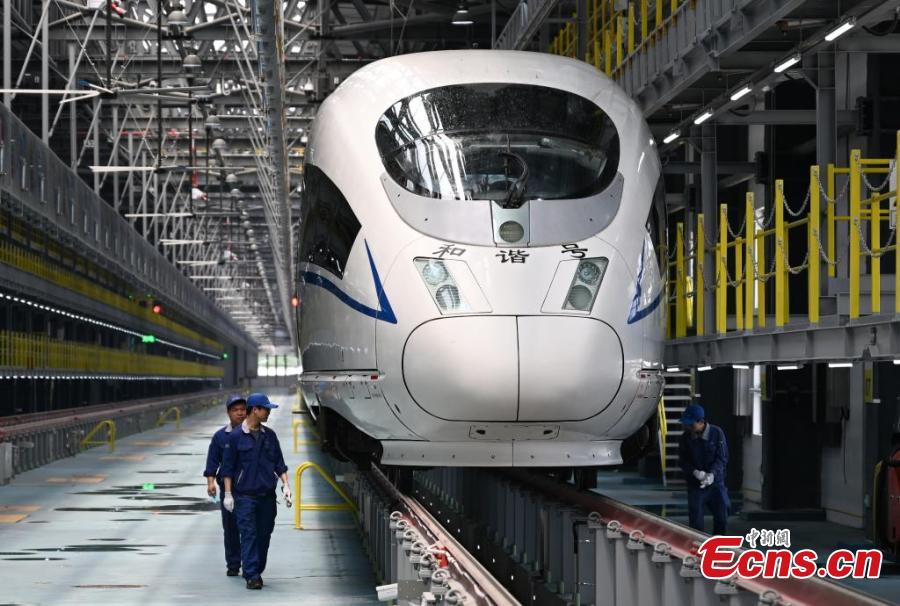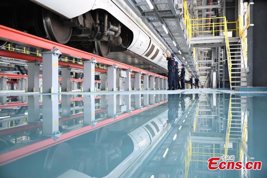 Staff members inspect a high-speed train at the Yongjin high-speed train base in Ningbo, east China's Zhejiang Province, April 9, 2025. (Photo: China News Service/Wang Gang)